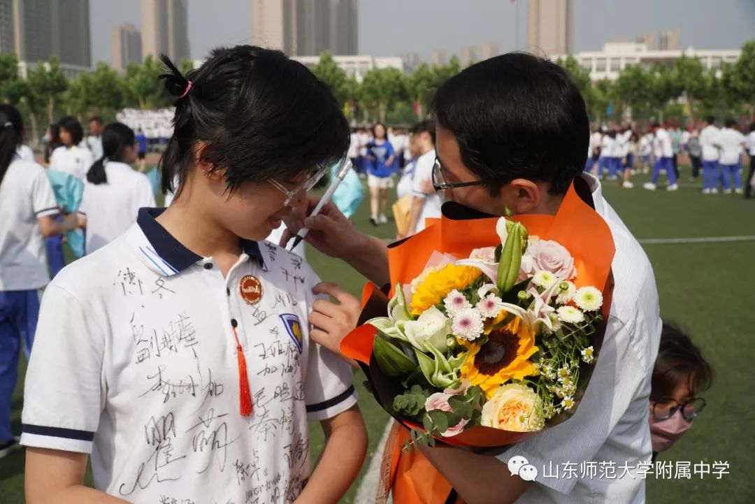 典礼上,高三学生代表向全体高三教师献花,感恩老师三年来的指导与关爱。各班班主任为每位同学戴成人帽、正衣冠、戴徽章,体现了浓浓的师生情谊,把典礼的气氛推到了高潮。