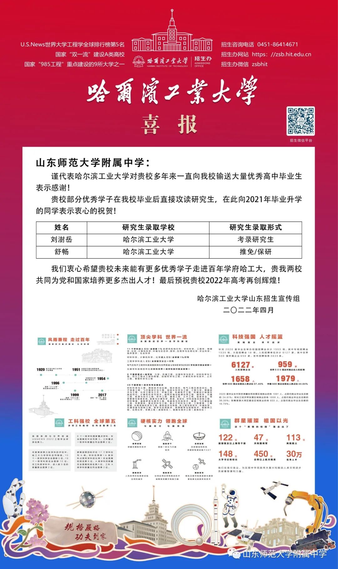 哈尔滨工业大学向山师附中发来喜报!祝贺刘澍岳、舒畅两位优秀附中毕业生取得优异学习成果