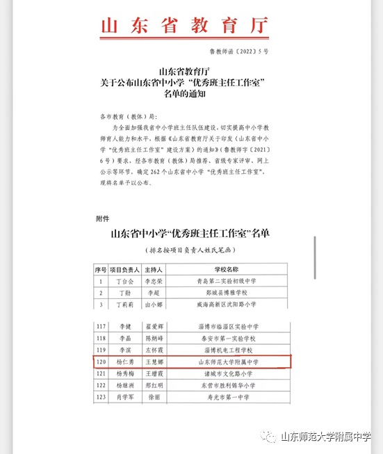 2022年2月23日,山东省教育厅发布了《关于公布山东省中小学“优秀班主任工作室”名单的通知》。山东师大附中推荐的由副校长杨仁勇担任工作室负责人,王慧娜为工作室主持人,宋梅、孟祥峰、王军、冯照、张萍、王兆阳、张军伟、仕大伟、姜艳、孔德星、付海建为成员的班主任工作室获批成为首批山东省中小学“优秀班主任工作室”,成为济南市成功入选的三所高中优秀班主任工作室之一。