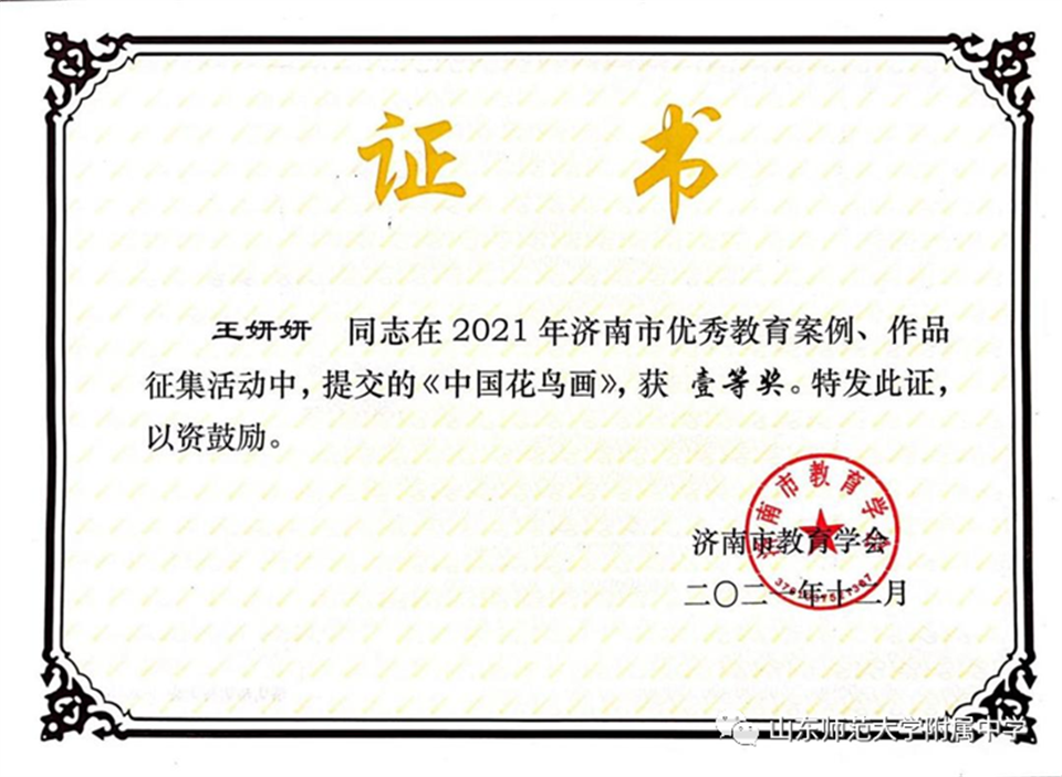 2021年度,美术学科喜获多项佳绩。在“山东省中小学美术教育成果展”中王欣老师携学生的版画、扎染、传统纹样作品《中国印记•版画、扎染与手绘》喜获佳绩成功入选;周洁老师的课例《北京四合院的美学意蕴》被评为“济南市高中美术新教材优秀课堂教学设计案例展评”一等奖;王妍妍老师的课例《中国花鸟画》获“2021 年济南市优秀教育案例、作品”一等奖。