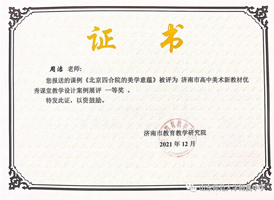 教育教学方面,面对新课程、新课标,山东师大附中美术学科重视专业素质提升,深入开展教学研究,以研促教,在山东师大附中第16届教学年会中特别邀请济南市教研院美术教研员张焕玉、济南市美术学科“五维教研”课堂教学维度高中组组长王辉两位专家到校指导教育教学工作。教学年会中周洁老师的《北京四合院的审美》、王妍妍老师的《格尔尼卡赏析》公开课被评为新教材公开课优课。