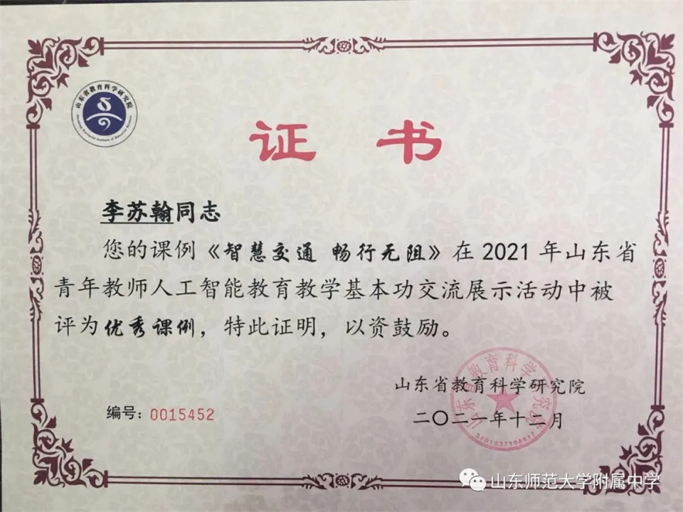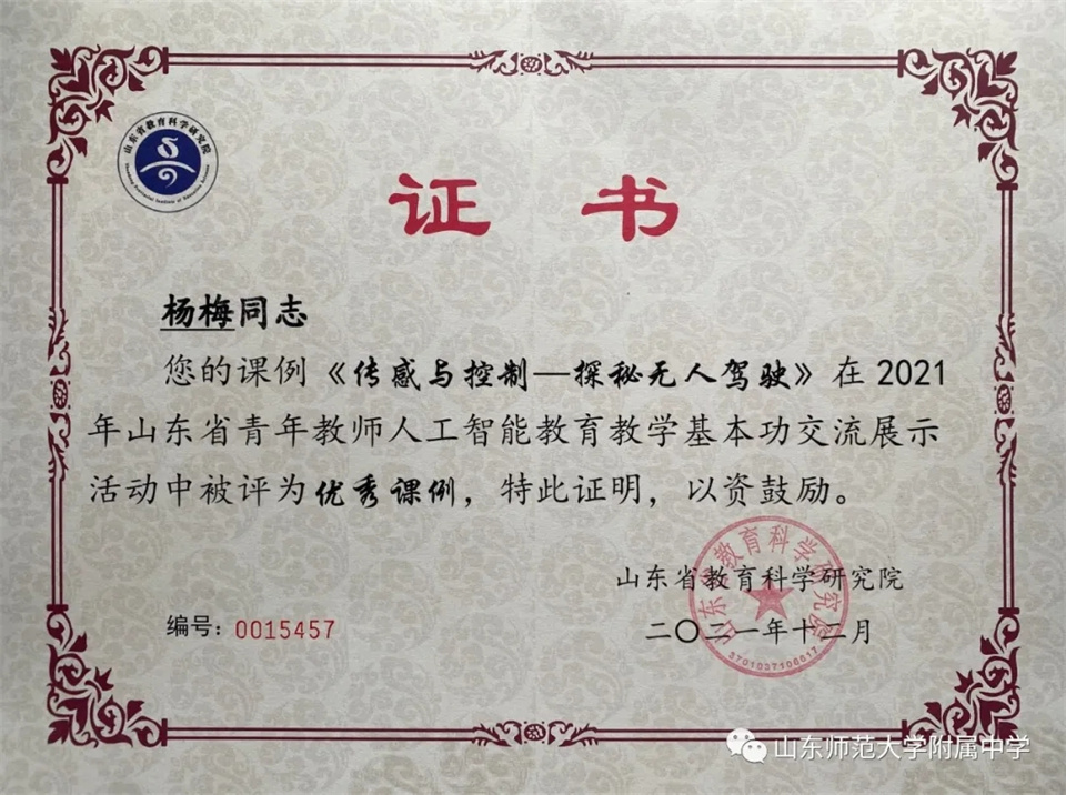 根据《关于举办全省青年教师人工智能教育教学基本功交流展示活动的通知》(鲁教科院函〔2021〕67号)要求,经逐级推荐、专家评选,山东省共确立83个课例为优秀课例,其中山东师大附中李苏翰老师的课例《智慧交通 畅行无阻》和杨梅老师的课例《传感与控制—探秘无人驾驶》入选省级优秀课例。
