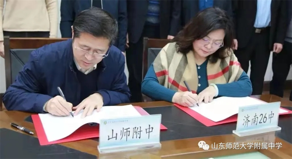 2022年1月14日上午,山东师大附中与济南市第二十六中学签订战略合作协议书,正式建立长期合作关系。槐荫区教育和体育局副局长、区教研中心主任李卫东,槐荫区教育和体育局副局长刘一颍,山东省济南第二十六中校长邵艳侠、副书记匡逢瑞、副校长刘奇、副校长刘栋,山东师大附中校长荆兆晶,党委书记孟宪喆,副校长陈德海、副校长刘从军,党政办公室主任杨平和工会主席李苏翰出席了签约仪式。