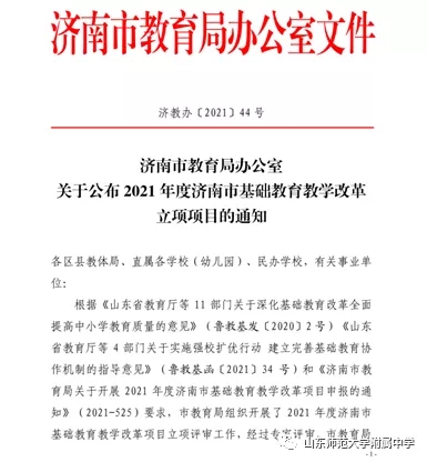 1月11日,接济教办([2021]44号)通知,经过专家评审、市教育局审核,山东师大附中校长荆兆晶主持申报的教改项目“‘筑梦工程’德育课程与实施研究”(立项编号:2021-JJCG-062)、数学组教研组长王秀梅主持申报的教改项目“高中进阶数学建模校本课程开发与实施”(立项编号:2021-JJCG-073)被立项为2021年度济南市基础教育教学改革项目。