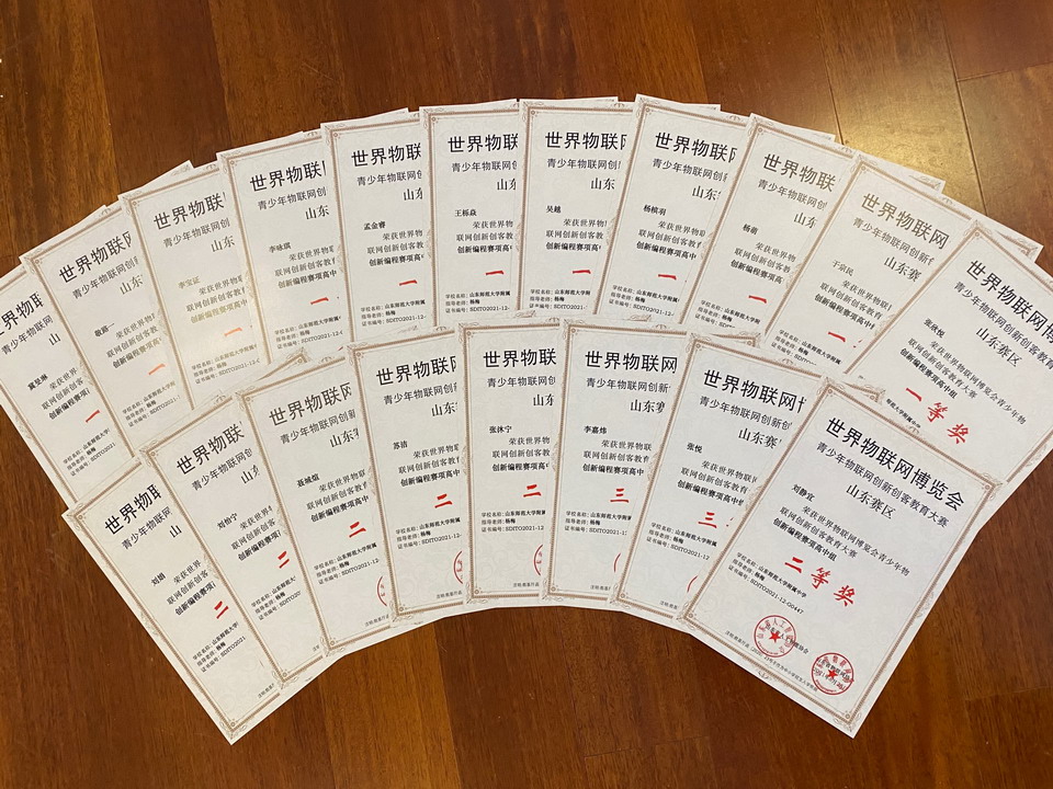 世界物联网博览会青少年物联网创新创客大赛是教育部办公厅公布的2020-2021学年面向中小学生的全国性竞赛活动,是针对全国中小学生的自然科学素养类比赛。山东师大附中19名同学借助信息技术课堂所学编程知识,利用课余时间和暑假集训充分备战比赛,最终取得优异成绩。