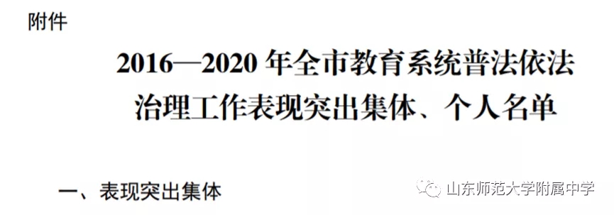2022年1月4日,中共济南市教育局党组对在2016-2020年全市教育系统普法依法治理工作中表现突出的集体进行通报表扬。山东师大附中被评为表现突出集体。