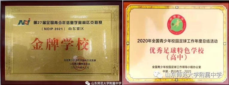 学校相继出台有关“十四五”发展规划、特色建设实施方案、“筑峰”建设工程实施意见、选科指导意见、教育教学督导管理办法、教辅人员管理办法、学生奖励办法、教学事故认定与处理办法、家校联系制度等17项文件,依法治校、依法施教有章可循,治理效能不断提升,学校品牌再添光彩。一年来,学校获得全国、省、市荣誉19项,被评为济南市教育系统表现突出集体,济南市“领航学校”立项培育校,山东省首批普通高中省级学科基地(外语),济南市首批普通高中市级学科基地(外语、数学),济南市学科教研示范学校,首批济南市“基于教育改革、融合信息技术的新型教学模式”示范校,2021全国人工智能创新教育国际合作项目学校,山东省心理健康教育先进单位,全国青少年信息学奥林匹克联赛金牌学校,全国校园足球优秀足球特色学校(高中),全国中学生创新作文大赛基地校,2016—2020年全市教育系统普法依法治理工作表现突出集体,济南教育政务新媒体优秀单位,山东师大宣传思想工作先进单位,济南市青少年模拟政协提案“优秀组织单位”,第十七届北京青少年公益电影节全国青少年原创影片大赛最佳组织奖,第三届“泉城新青年杯”普通高中学生辩论赛优秀组织奖等。“微电影节”荣获济南市第三届中小学“德育品牌”,1项改革案例荣获第二届“济南教育榜样”提名奖。