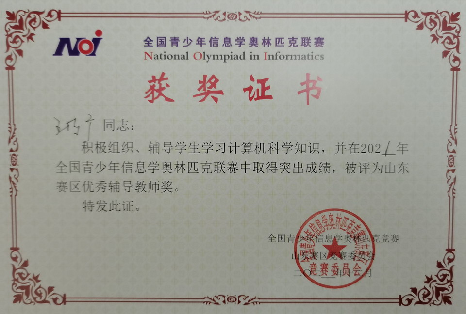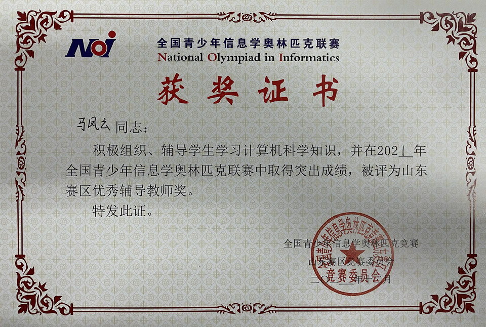 山东师大附中获得“全国青少年信息学奥林匹克联赛山东省赛区金牌学校”和“山东省青少年信息学奥林匹克科普创新基地”称号,马凤云和王乃广获“优秀辅导教师”称号。这是2007年至今山东师大附中连续15年获得“金牌学校”殊荣。山东师大附中15年来多次承办全国青少年信息学奥林匹克竞赛省队选拔和山东省总结表彰大会等活动,荣获“科普创新基地”称号。