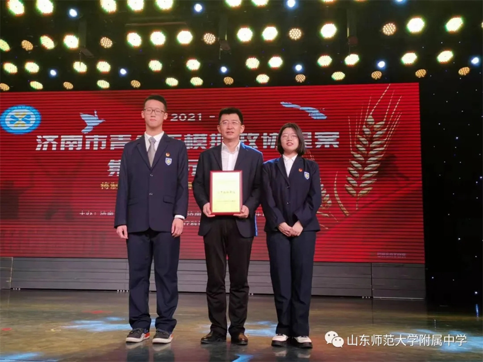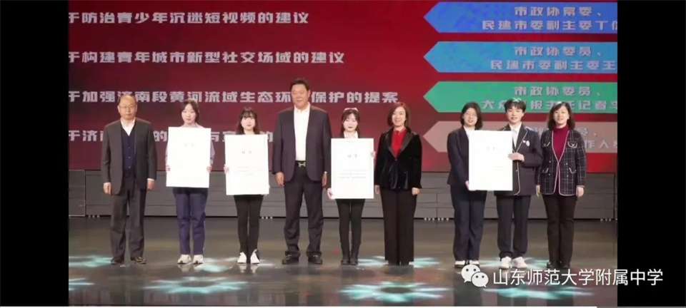 2021年12月17日上午,济南市青少年模拟政协提案集中展示活动如期举行。山东师大附中2019级(4)班石天舒提案组提交的《关于以制度和法规保障海绵城市建设的提案》获济南市“十佳青少年模拟政协提案”,山东师大附中提交的20份提案获“优秀青少年模拟政协提案”,山东师大附中获得“优秀组织单位”。山东师大附中副校长刘从军、团委副书记胡兆强参加颁奖仪式。