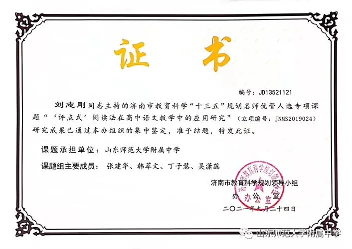 12月16日,山东师大附中刘志刚、杨平两项济南市教育科学“十三五”规划名师优管人选专项课题顺利结题。同日,济南市教育局举行济南名师、济南优管建设工程结业仪式,马艳文、刘志刚、杨平正式结业,获得济南名师、济南优秀教育管理者证书。