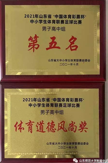 10月30日,由山东省教育厅、山东省体育局共同举办的2021山东省“体彩杯”高中足球联赛在潍坊落下帷幕。山东师大附中男足以4胜2负的战绩获得第五名。