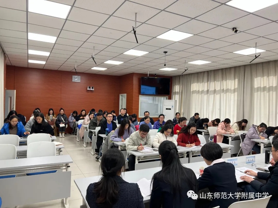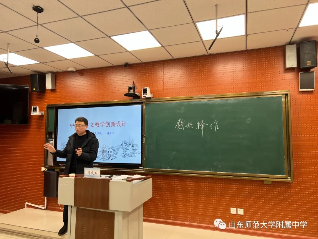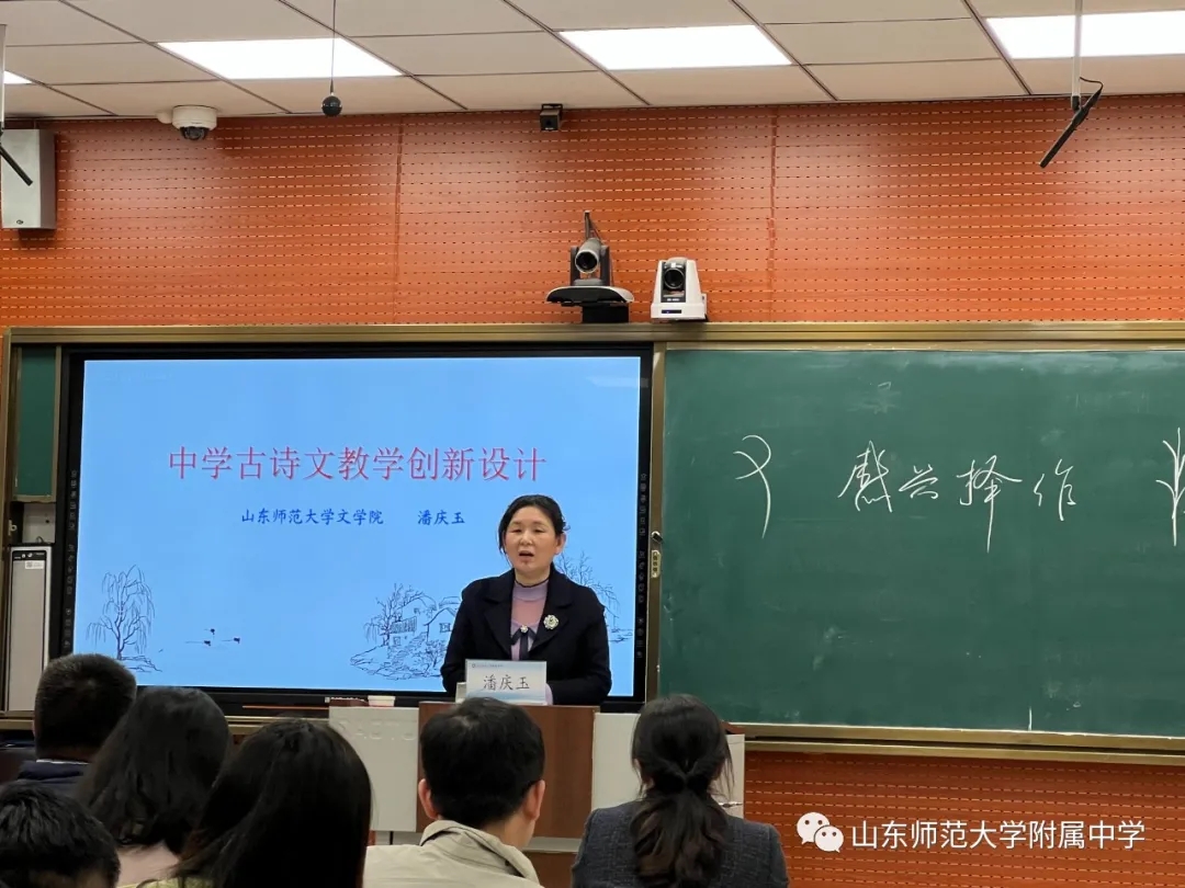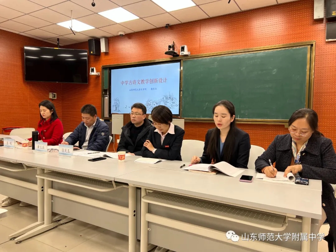 为进一步提高教师的专业素养和教学能力,破解新教材授课中的诗词教学难点,促进教师交流、思辨、学习,12月3日上午,山东师大附中语文组开设第16届教学年会之诗词专题新教材研究课。本次活动邀请了山东师范大学大学文学院语文教学论教授潘庆玉、山东省教科院教研员黄玉兵、山东省教科院访问学者王娟莅临指导,山东师大附中副校长陈德海,副校长、幸福柳分校执行校长杨仁勇,幸福柳分校教务主任李成金和语文组全体教师参加活动,活动由教研组长马艳文统筹、杨海燕主持。