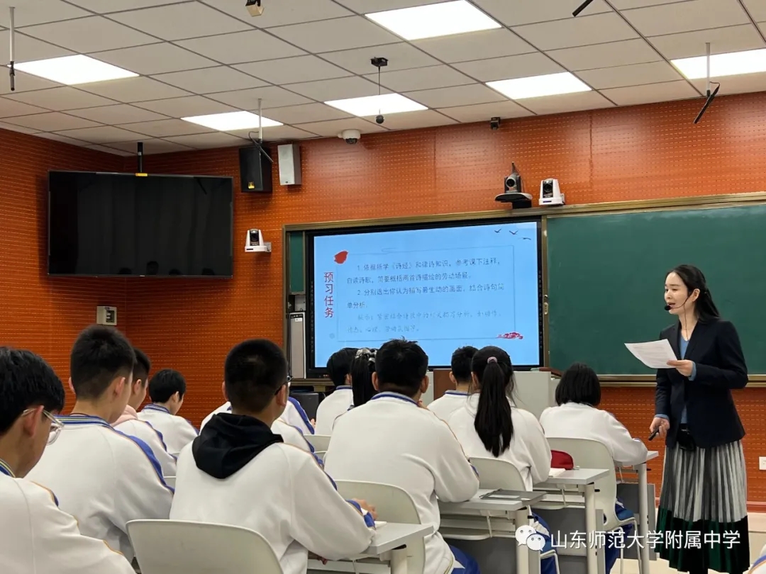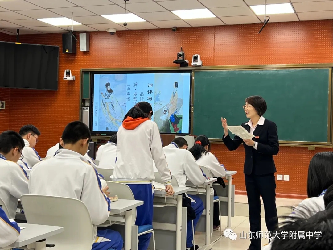 附中高一语文教师王玮、韩萃文分别执教新教材研究课《词评写作升格——品评<念奴娇·赤壁怀古>和<声声慢>》和《“诗韵”里的生活之劳动歌——<芣苢><插秧歌>》。王玮老师依据读写结合理念,通过引导学生赏析经典词评及修正学生词评中的问题,逐步指导学生总结词评写作的方法“聚焦角度”“品词细致”“叙评结合”“比评小点”,脉络清晰,将学生的写作落到实处。韩萃文老师以“山东师大附中高一语文组组织学生编写《诗韵里的生活》诗词导读特辑”情境导入新课,并以此情境贯穿课堂始终,注重在品读中领悟诗歌情感、鉴赏画面,充分调动了学生参与课堂的积极性。两位老师潜心研究教材,精心设计教学过程,授课中思路清晰,讲解细致,指导到位,获得了在场听课老师们的一致好评。