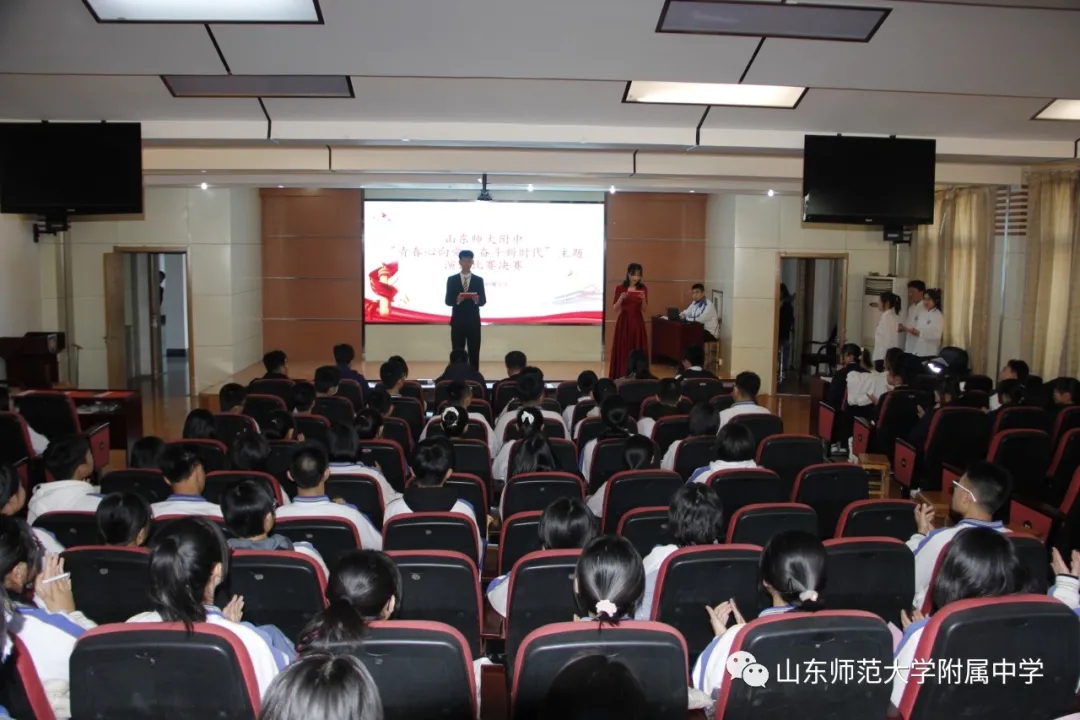 百年征程波澜壮阔,百年初心历久弥坚。为进一步落实共青团中央关于在全团青年中学党史、强信念、跟党走的相关文件精神,引领青年学生悟思想、勇奋进,铭记中国共产党的百年奋斗光辉历程,2021年11月26日和29日,山东师大附中分别在两校区开展了首届学术科技文化节系列主题活动之“青春心向党,奋斗新时代”主题演讲比赛决赛。山东师大附中校长荆兆晶、党委书记孟宪喆分别在两校区出席活动,部分中层干部、班主任和教师代表参加活动。 比赛特邀谭菲依(中央电视台《挑战主持人》冠军、第五届海峡两岸大学生辩论赛亚军、山东省高校教师演讲大赛一等奖获得者)、刘武洋(高一语文组老师)在本校区;赵云老师(高二语文备课组长)、石敏老师(高三年级语文备课组组长)、宁卫兵(数学教研组副组长)、曾冠予老师(教工团支部青年教师代表)在分校区担任评委。两校区高二年级共19位选手进行了热情洋溢的演讲。比赛中,选手们紧紧围绕主题,用真挚的情感、生动的语言,热情讴歌了党的丰功伟绩,祖国的日益强盛,引领同学们感悟中国共产党始终不渝的为民初心,传承中国共产党在不懈奋斗中铸就的伟大精神。冠亚季军分别被本校区宋佳澎(高二5班)、尉照哲(高二8班)、栾佳慧(高二12班);分校区许倞维(高二32班)、褚月(高二17班)、赵宛晴(高二24班)获得,其他参赛同学分获一二等奖。