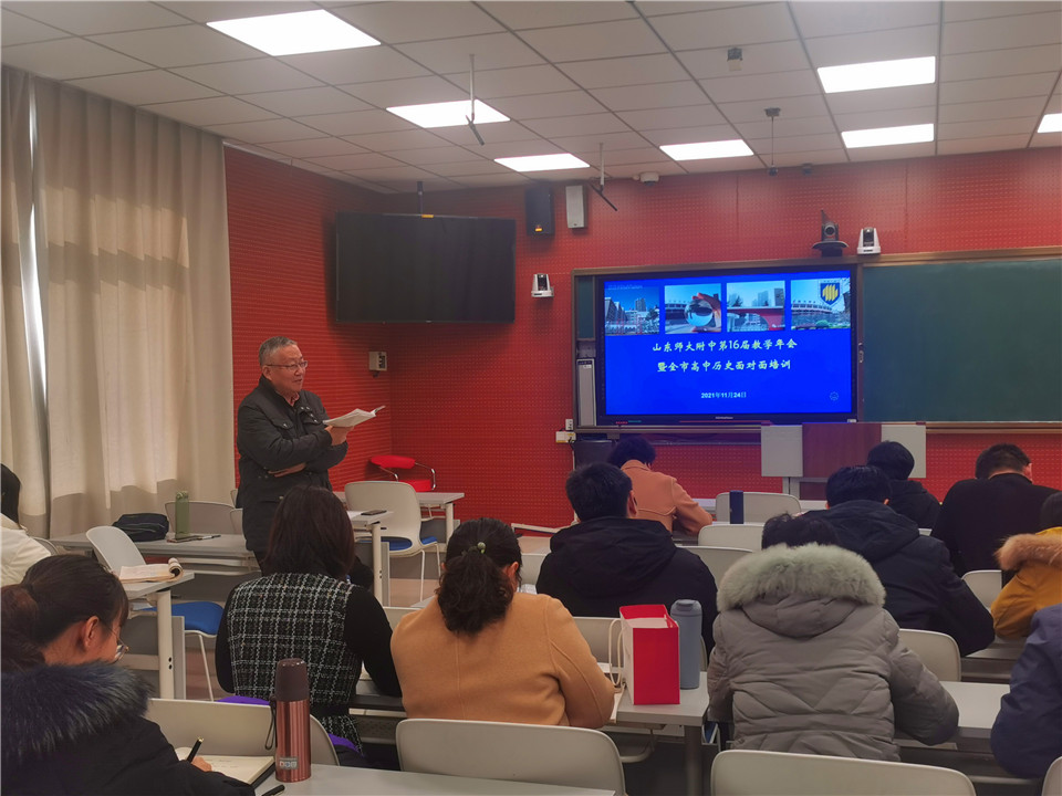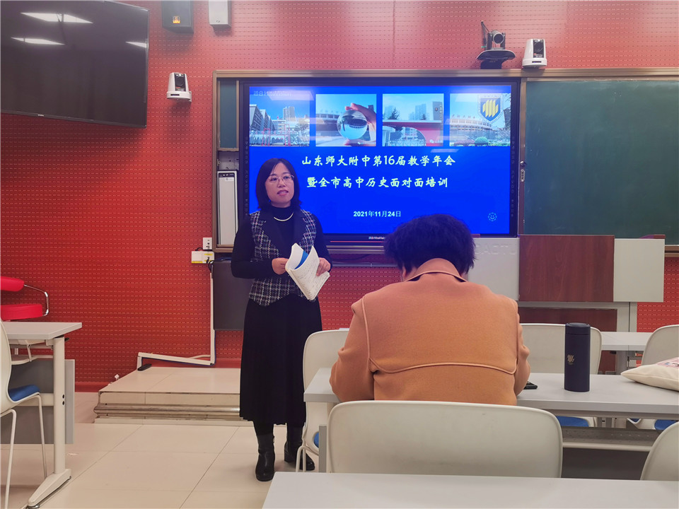 为深化教师对历史核心素养的理解认识,提升学科教师的专业素养和教学质量,进一步增强高三复习备考研究水平,11月24日上午,山东师大附中幸福柳校区举行山东师大附中第16届教学年会系列活动之历史年会暨全市高中历史面对面培训。齐鲁师范学院教授齐健、济南市教研院教研员边海长,山东师大附中校长荆兆晶、副校长杨仁勇莅临指导教研活动。山东省高中历史特级教师工作坊济南市群组成员、山东师大附中幸福柳校区历史组全体教师现场观摩。活动在网络平台进行同步直播,济南市各校高中历史教师同步观看。山东师大附中历史教研组组长孟伟主持活动。