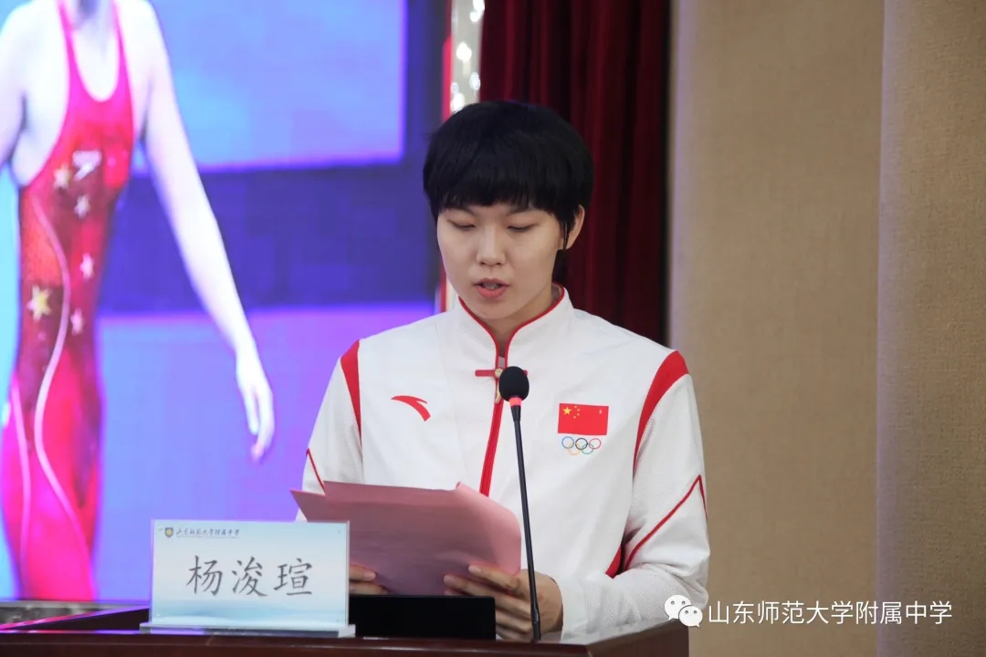 活动伊始,全体人员共同观看了杨浚瑄等六名山东籍选手在东京奥运赛场上的拼搏场景,杨浚瑄通过刻苦训练,不畏强敌,把祖国和梦想永记心间,为了国家而永不放弃的精神感染了每一位同学;杨浚瑄同时向大家分享了她的成长故事。