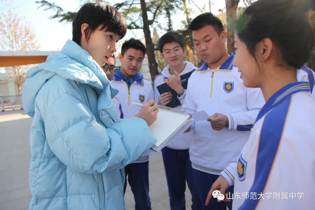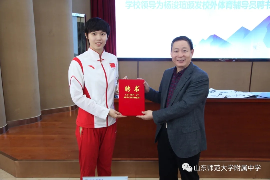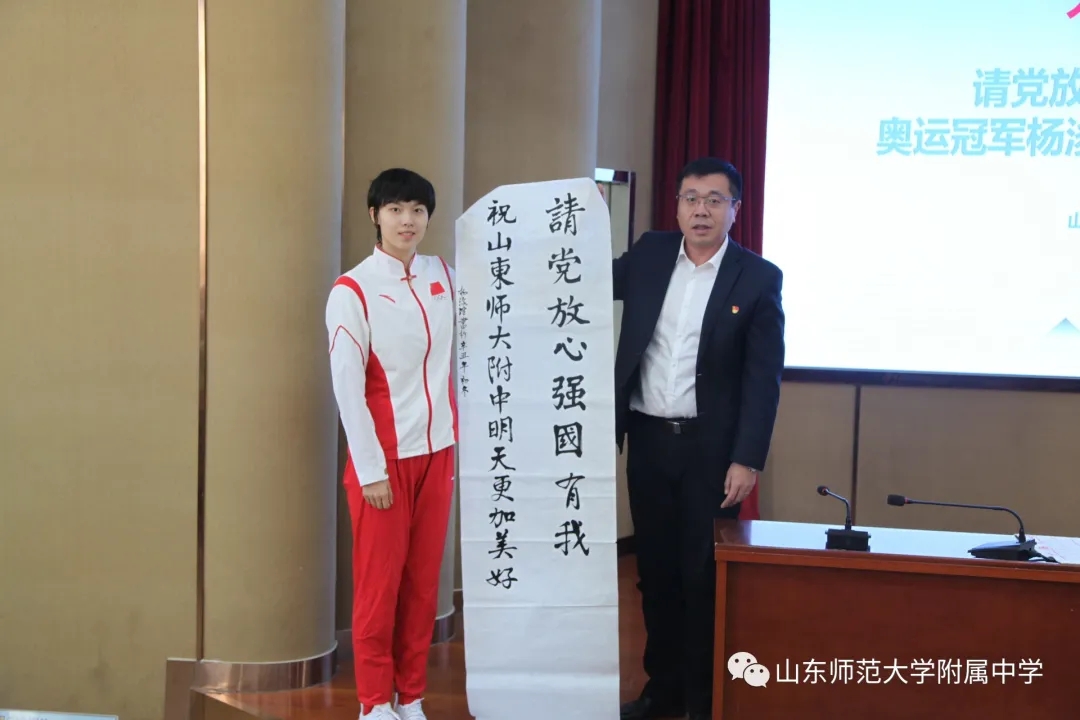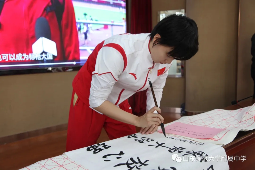 分享结束后,杨浚瑄在现场用毛笔写下“请党放心、强国有我!祝山东师大附中的明天更加美好!”的祝福,孟宪喆代表学校接收杨浚瑄的书法作品并代表学校对其表示感谢。刘从军为杨浚瑄颁发校外体育辅导员聘书并代表学校将学校特色文创产品校服熊赠予杨浚瑄一行。学生代表代表全体同学为杨浚瑄赠送鲜花。