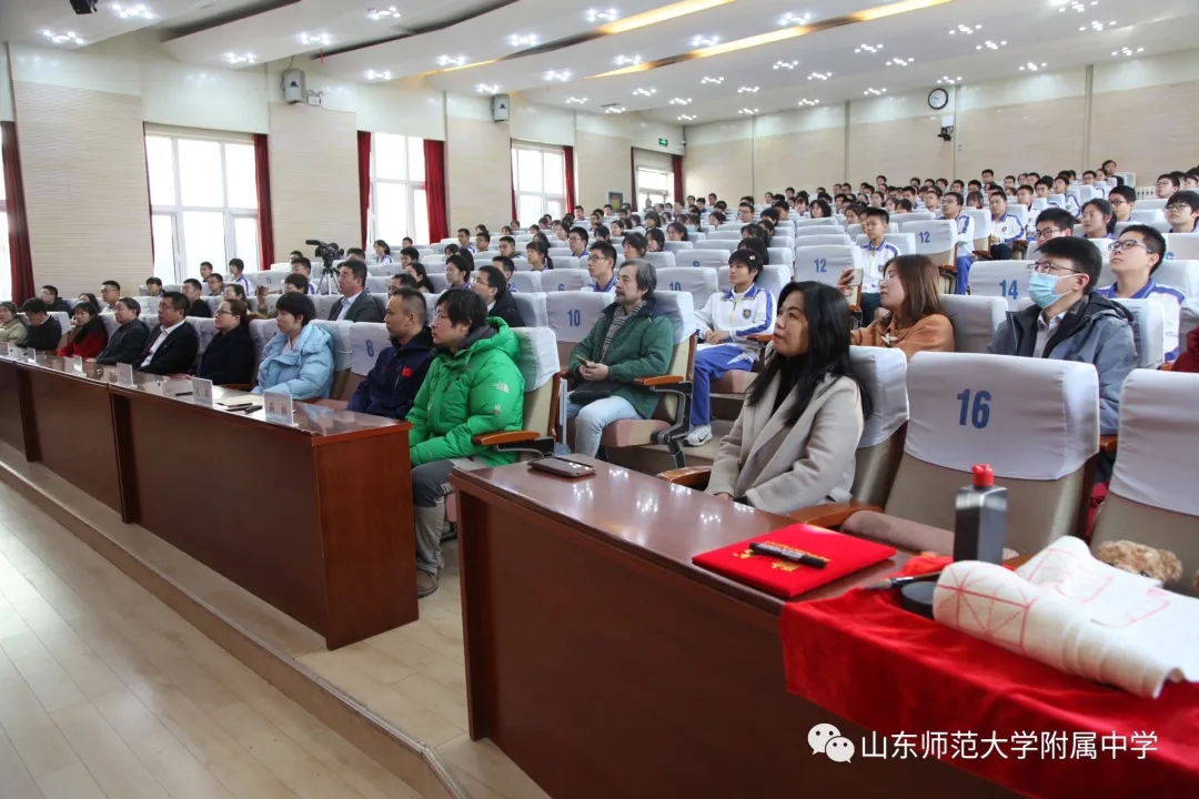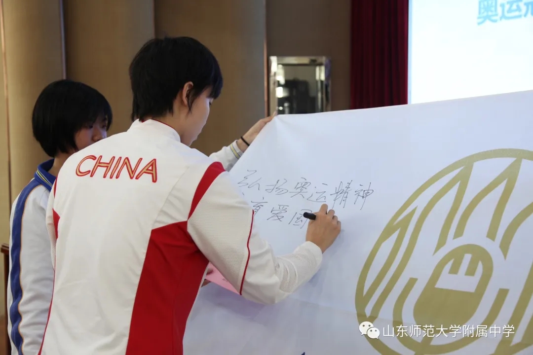 本次讲坛恰逢“大家讲坛”10周岁生日,在这十年中,众多专家、校友、老师和学生都在这个舞台上传递着自己特有的声音,迸发着让附中青年学生不断前进的力量。孟宪喆和杨浚瑄共同将具有“大家讲坛”的专属标识——“大家讲坛旗”呈现给大家,这一旗帜是附中“大家讲坛”十年征程的见证,更是接下来附中“大家讲坛”走向远方的力量。杨浚瑄在旗帜上写下“弘扬奥运精神,争做强国少年”并签名,激励同学们刻苦学习,奉献社会,践行“请党放心,强国有我”的铮铮誓言。