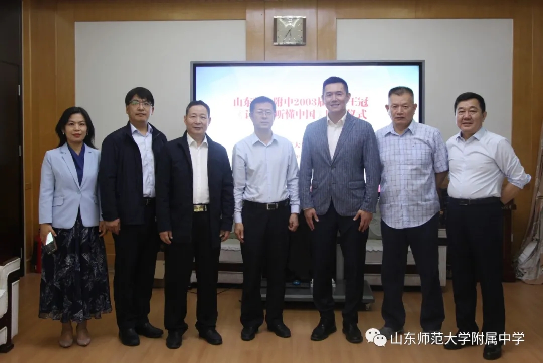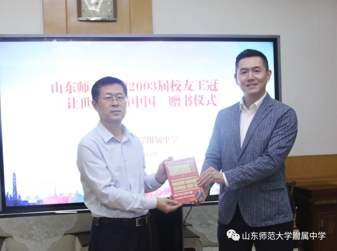 王冠为母校捐赠了他出版的新书《让世界听懂中国》,山东师大附中校长荆兆晶接收捐赠。附中副校长刘从军、杨仁勇,王冠的班主任老师张寿忠,化学老师、党政办公室主任杨平参加捐赠仪式。