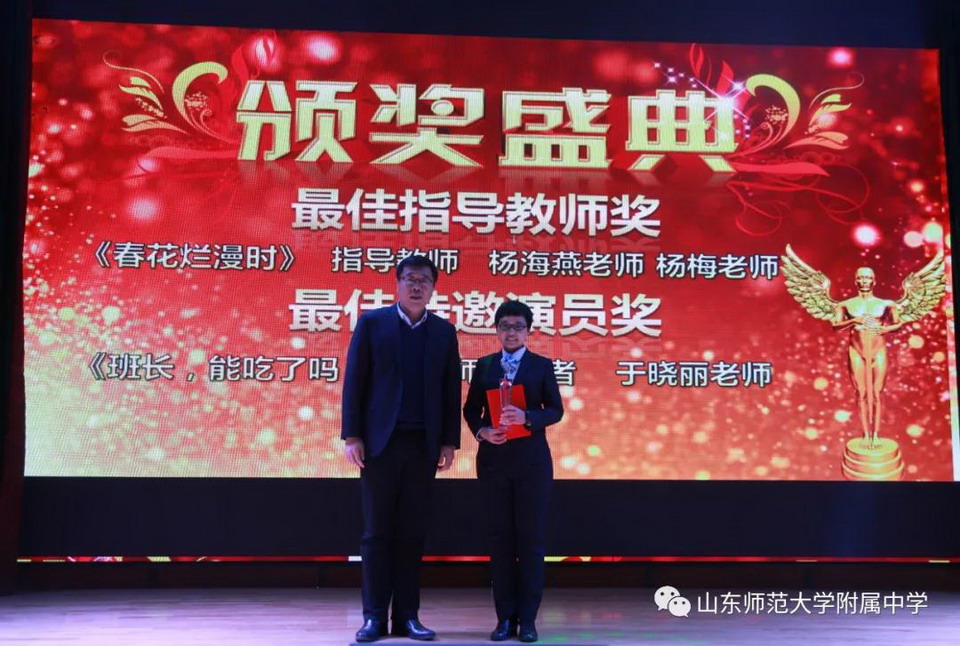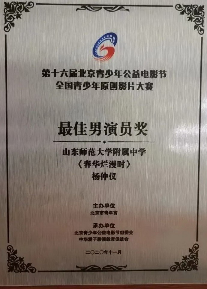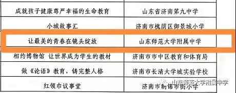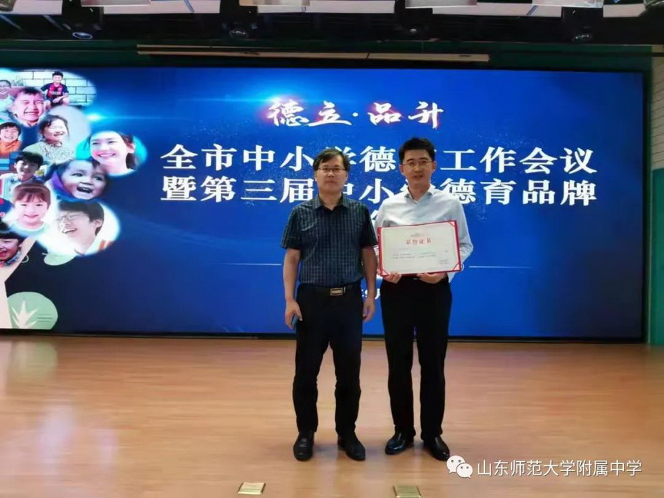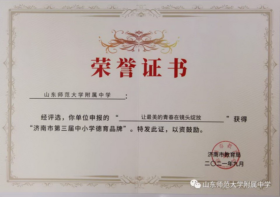 2021年9月14日,全市中小学德育工作会议暨济南市第三届中小学德育品牌推介会召开。在前期发布两届、共70个德育品牌的基础上,本次会议发布了“济南市第三届中小学德育品牌”,山东师大附中报送的《让最美的青春在镜头绽放》(微电影节)最终入围,荣获“济南市第三届中小学德育品牌”。这是继戏剧节获得首届德育品牌之后,山东师大附中荣获的第二个德育品牌。山东师大附中副校长刘从军、团委副书记胡兆强代表学校领奖。
