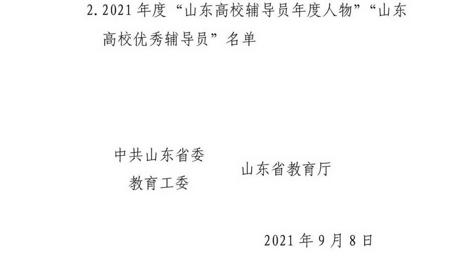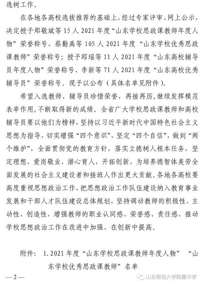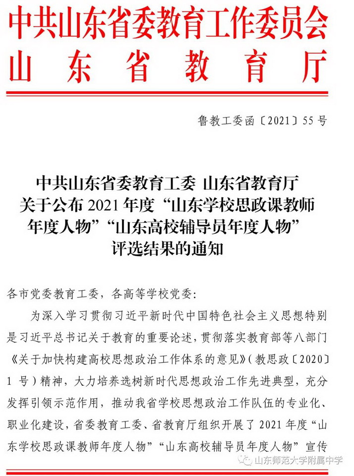 为深入学习贯彻习近平新时代中国特色社会主义思想特别是习近平总书记关于教育的重要论述,贯彻落实教育部等八部门《关于加快构建高校思想政治工作体系的意见》(教思政〔2020〕 1 号)精神,大力培养选树新时代思想政治工作先进典型,充分发挥引领示范作用,推动全省学校思想政治工作队伍的专业化、职业化建设,省委教育工委、省教育厅组织开展了2021年度“山东学校思政课教师年度人物”“山东高校辅导员年度人物”宣传选树工作。在各地各高校选拔推荐的基础上,经过专家评审、网上公示,决定授予郑敬斌等 15 人 2021 年度“山东学校思政课教师年度人物”荣誉称号、蔡勤禹等 105 人2021 年度“山东学校优秀思政课教师”荣誉称号;授予邱瑶等 11 人 2021 年度“山东高校辅导员年度人物”荣誉称号、李新等 71 人 2021 年度“山东高校优秀辅导员”荣誉称号。山东师大附中徐海霞老师获评2021年度“山东学校优秀思政课教师”。