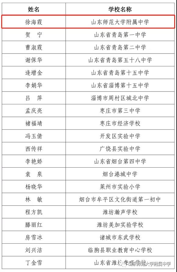 9月8日,省委教育工委、省教育厅组织开展的2021年度“山东学校思政课教师年度人物”“山东高校辅导员年度人物”宣传选树工作结果公布,山东师大附中徐海霞老师喜获2021年度“山东学校优秀思政课教师”称号。