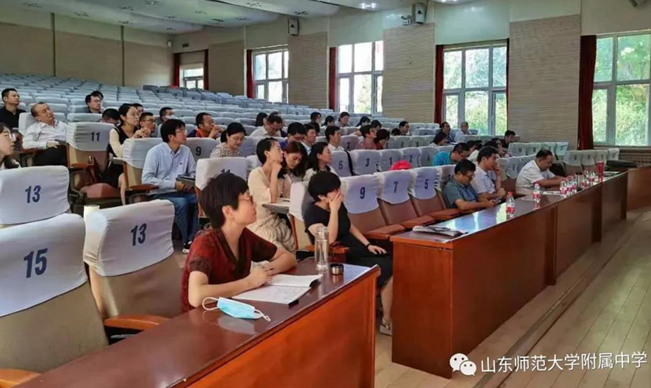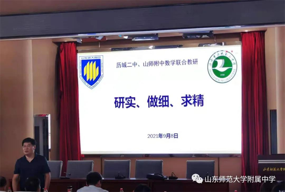 为进一步提升教师专业技术水平,深化课程改革,改进教学方法,拓展教研渠道, 9月8日下午,历城二中、山师附中数学组联合教研活动在山师附中校本部报告厅举行。济南市教育教学研究院数学教研员安学保、历城区教研员王义东、历城二中教科处主任、数学教研组长张治国、备课组长李军茹、张成凯,历城五中数学教研组长袁停位、备课组长胡晓庆和山师附中数学组全体教师参加活动。山师大附中数学教研组组长王秀梅主持活动。本次教研活动的主题是“研实、做细、求精”。