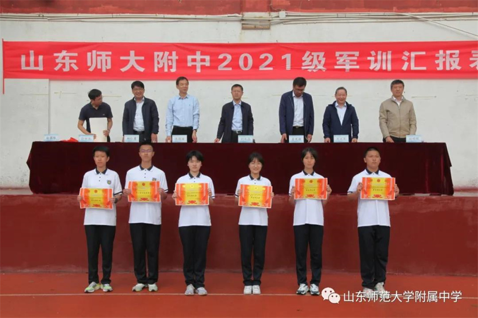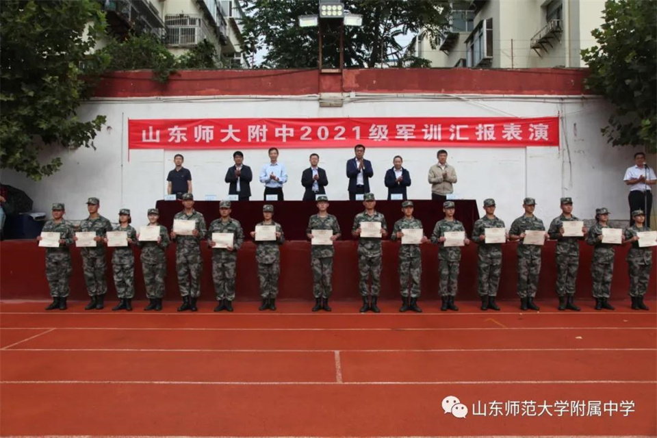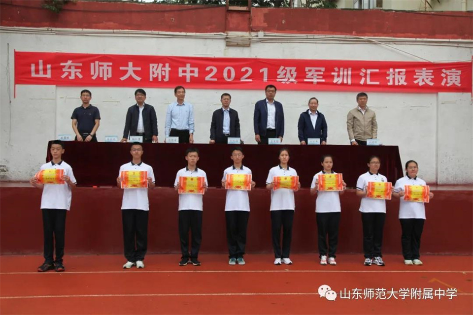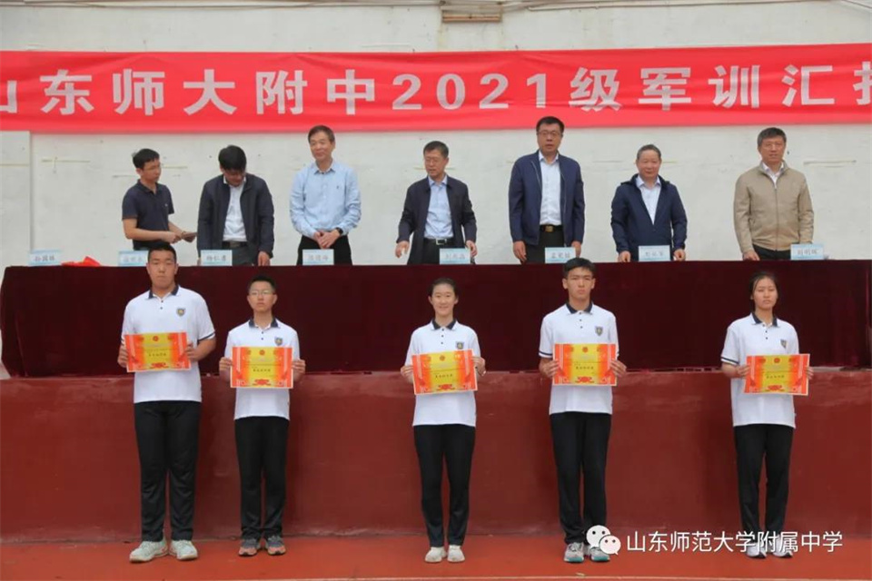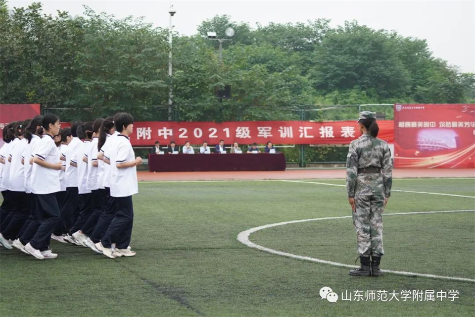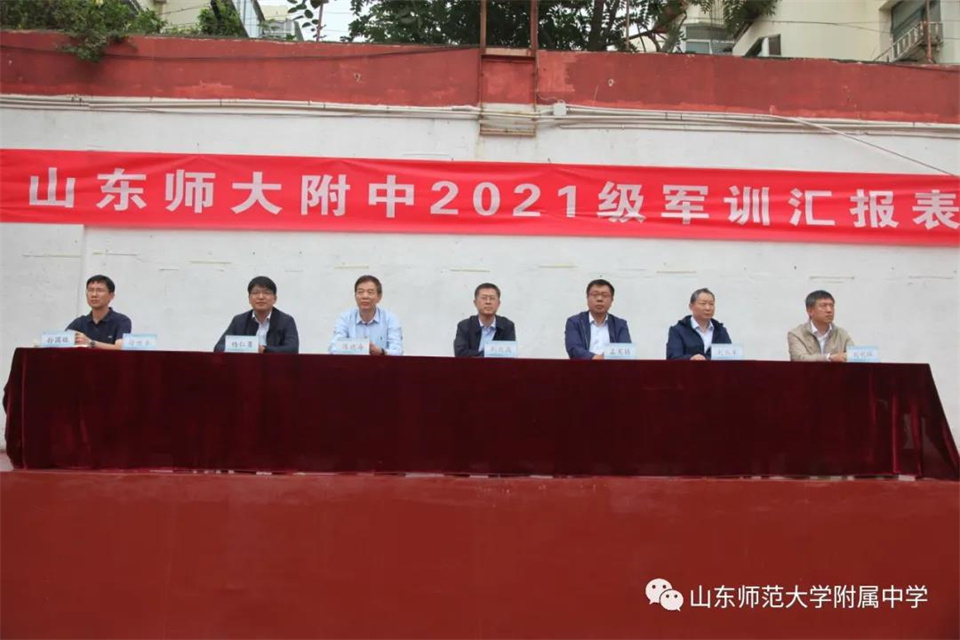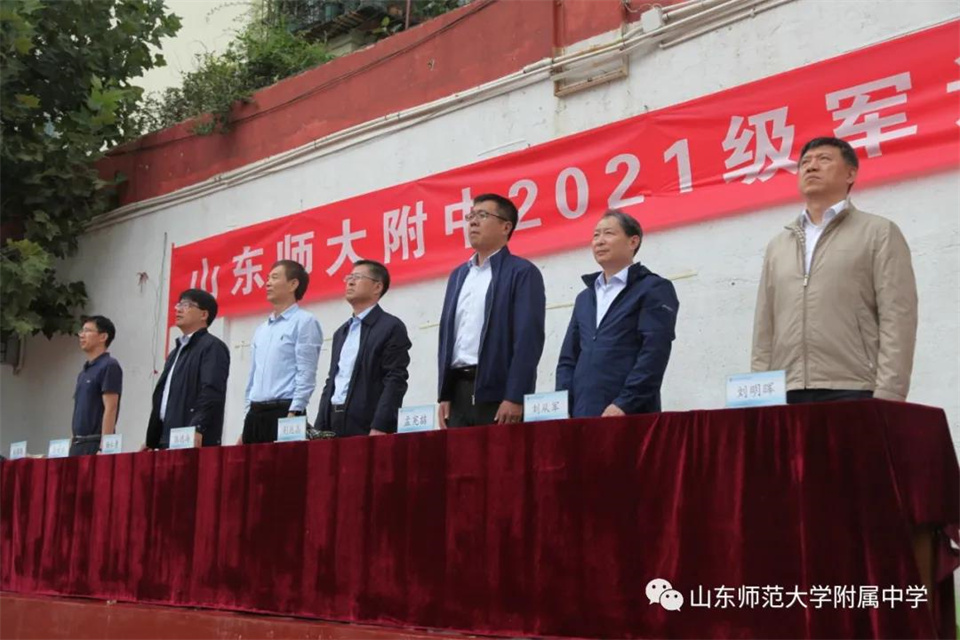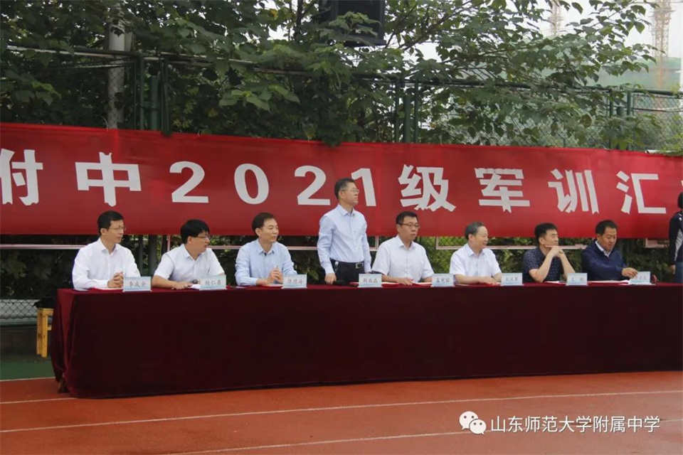 9月5日,山东师大附中校本部与幸福柳分校2021级军训汇报表演暨总结大会分别在两校区操场隆重举行。山东师大附中校长荆兆晶,党委书记孟宪喆,副校长陈德海,副校长、校本部执行校长刘从军,副校长、幸福柳分校执行校长杨仁勇,部分中层干部,军训团团长侯大阪等15位教官和高一年级全体班主任、学生、部分学生家长参加活动。活动分别由政教处主任徐世水、李宏波主持。