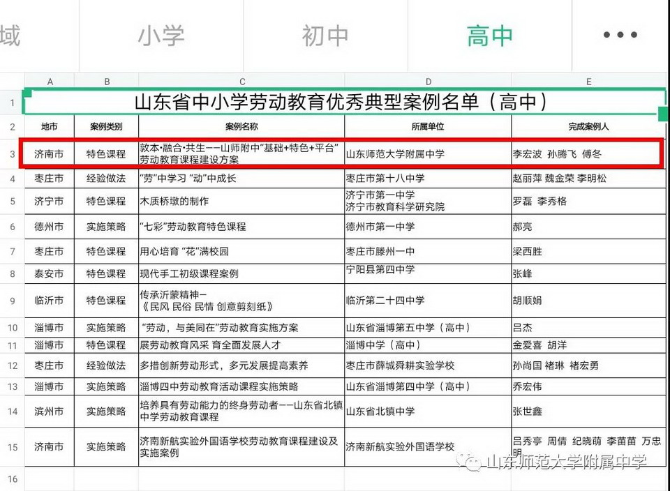 8月17日,在山东省教育科学研究院组织的“中小学劳动教育特色课程与实施策略典型案例”评选中,山东师大附中报送的《敦本•融合•共生——山师附中“基础+特色+平台”劳动教育课程建设方案》荣获高中组第一名。山东师大附中作为山东省唯一高中学校代表在“山东省新时代中小学劳动教育研讨会”上做典型发言。