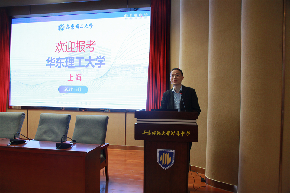 韦晓保和荆兆晶分别代表华东理工大学和山东师大附中签订“华东理工大学优质生源基地学校协议书”,荆兆晶接收“华东理工大学优质生源基地”牌匾。韦晓保表示,多年来,山东师大附中为华东理工大学输送了大量素养高、能力强、成绩优、潜力足的优秀毕业生,希望接下来两校进一步加强交流合作,促进高等教育与高中教育的有效衔接,形成整体化、系统化的优秀学生培养模式。荆兆晶表示,华东理工大学作为国家双一流、985、211工程高校,是很多附中学子心仪的高校,希望接下来两校能进一步探索高校和高中共同推进学生素质教育和创新培养机制,携手共育英才。韦晓保为附中学子、教师、家长就华东理工大学基本情况、往年招生情况和2021年招生政策作宣讲。