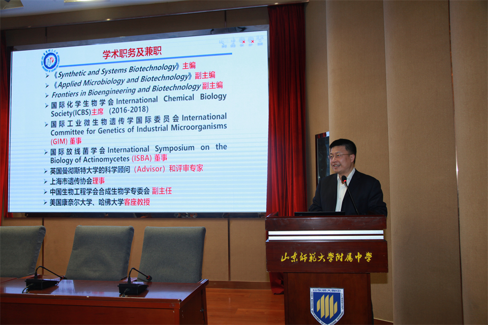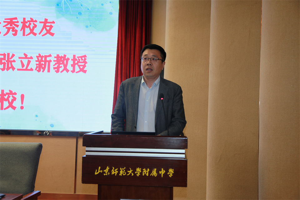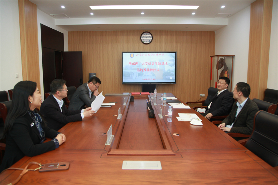 2021年5月4日下午,华东理工大学授予山东师大附中“优秀生源基地”仪式在山东师大附中校本部举行。山东师大附中1986届优秀校友、华东理工大学生物反应器工程国家重点实验室主任张立新教授,华东理工大学山东招生组组长韦晓保副教授,山东师大附中校长荆兆晶、党委书记孟宪喆、党政办公室主任杨平出席授牌仪式。张立新为附中学子作报告《为何你要攀上珠穆朗玛峰?》。活动由孟宪喆主持。