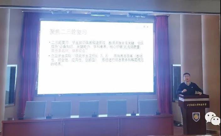 会议首先由张卫普对本次济南市高三模拟考试进行成绩分析。张卫普结合考试数据分析了考试的整体情况,对班级、备课组、任课教师、尖子生、边缘生等成绩数据作了深入细致的分析,并对接下来的高考备考工作提出了要求。