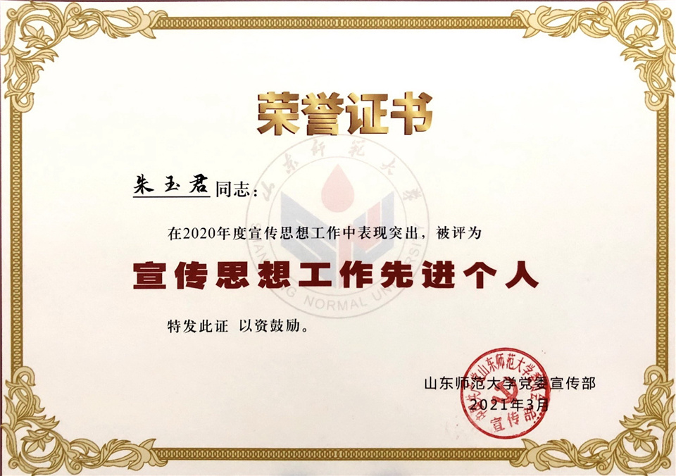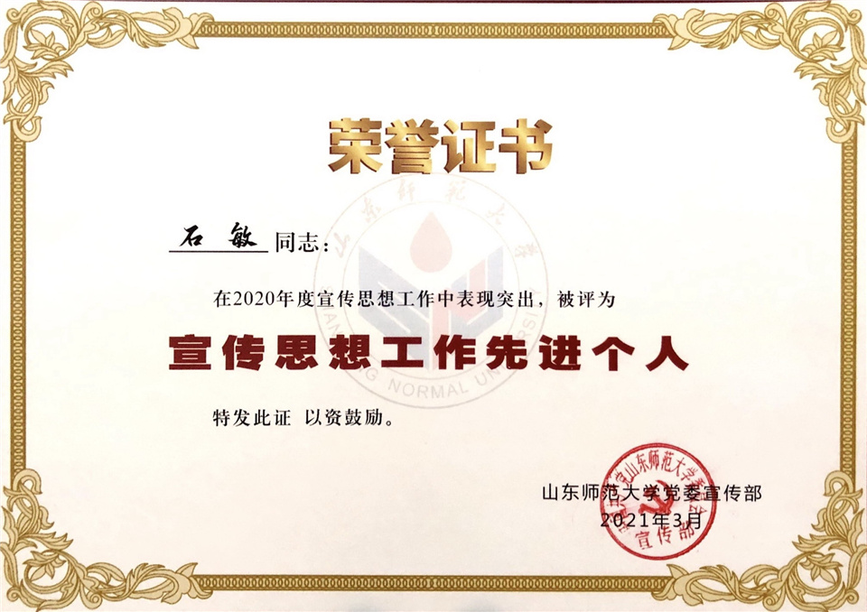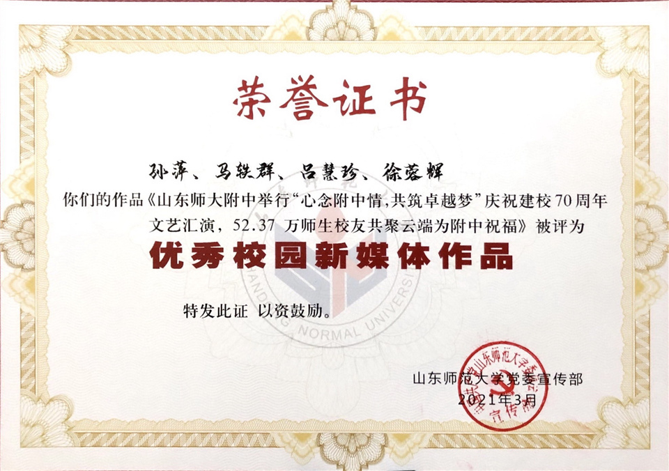 3月12日,山东师范大学2020年度宣传思想工作先优评选活动颁奖,山东师大附中喜获参评的全部4个奖项。学校荣获“山东师大2020年度宣传思想工作先进单位”称号,附中微信公众号荣获“山东师大2020年度优秀校园新媒体”称号,朱玉君、石敏荣获“山东师大2020年度宣传思想工作先进个人”称号,由孙萍、吕慧珍、徐蓉辉、马轶群等创作的新媒体作品《山东师大附中举行“心念附中情,共筑卓越梦”庆祝建校70周年文艺汇演,52.37万师生校友共聚云端为附中祝福》被评为“山东师大2020年度优秀校园新媒体作品”。