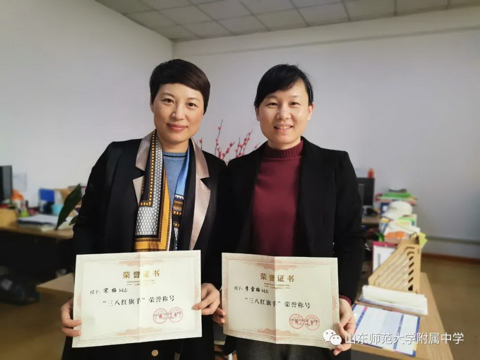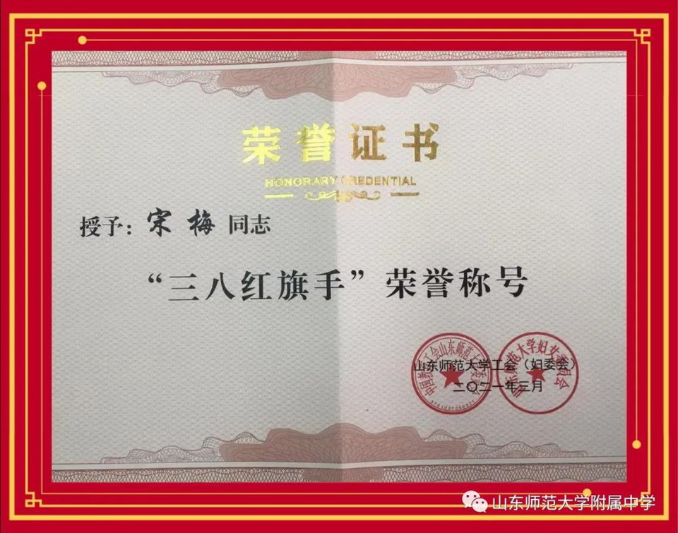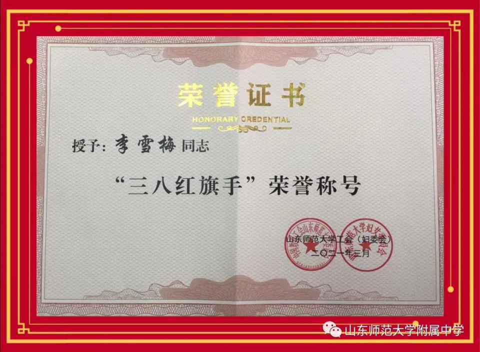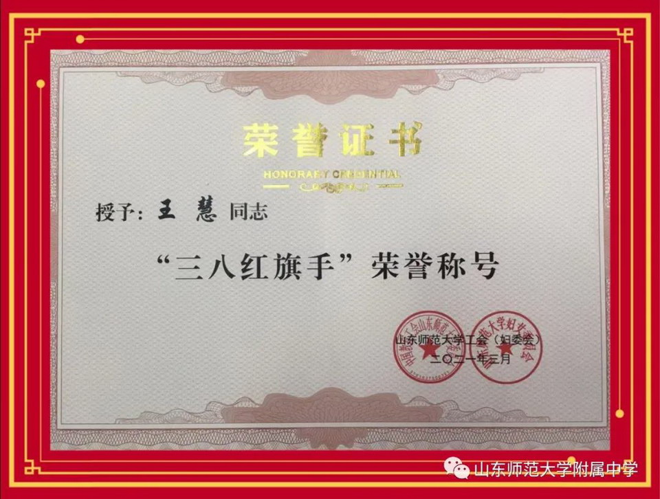 2021年3月8日,在全国人民同心同德共同抗疫的时刻,我们迎来了第111个“三八”国际妇女节,第98个“三八”中国妇女节。山东师范大学为表彰女教职工在工作岗位上做出的贡献和成绩,在组织推荐和评选的基础上,授予多名女教职工同志三八红旗手的荣誉称号。其中,山东师范大学附属中学孟伟老师获得“三八红旗手标兵”荣誉称号,王慧老师、宋梅老师和李雪梅老师获得“三八红旗手”荣誉称号。山东师范大学附属中学语文组获得“三八红旗手集体”荣誉称号。