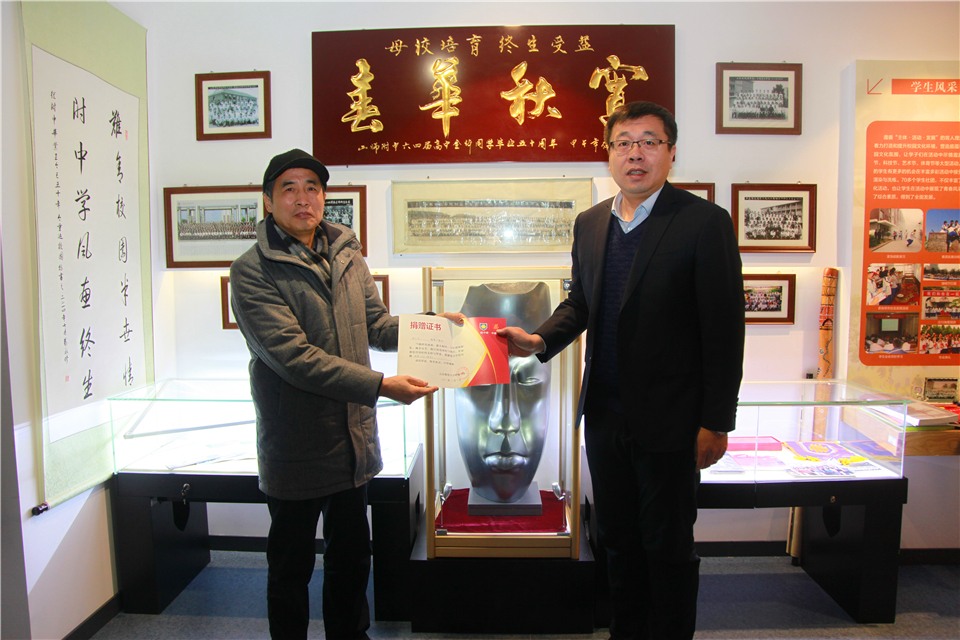 2020年12月31日上午,校友张志朴教授向母校捐赠陶瓷艺术品仪式在山东师大附中校本部举行。学校党委书记孟宪喆,纪委书记、副校长陈德海接待张志朴教授一行。学校工会李苏翰主席和王喜刚主任参加活动。张志朴教授在校时同学徐达、于敏、臧立申、谭鸣鸿、蒋洪、汤聿明、胡欣参加捐赠仪式。