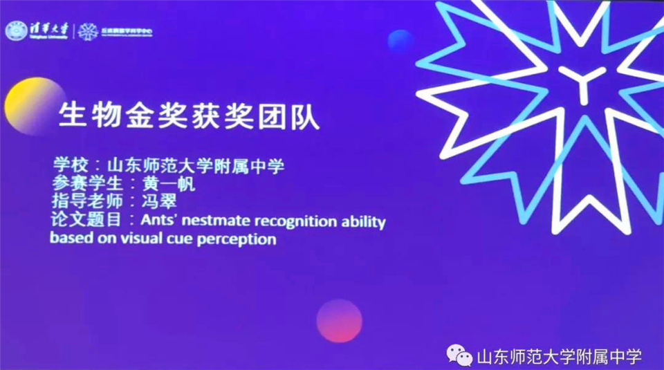 12月13日2020年丘成桐中学科学奖总决赛暨年度颁奖典礼日前在清华大学顺利闭幕。来自中国内地26个省市自治区、港澳台地区及美国、英国等17个国家400余所中学的1500余支团队、近1700名学生报名参赛。最终,来自山东师大附中国际部的黄一帆经过重重考验一路过关斩将,闯入总决赛并斩获丘成桐中学科学奖生物全国最高奖项金奖。