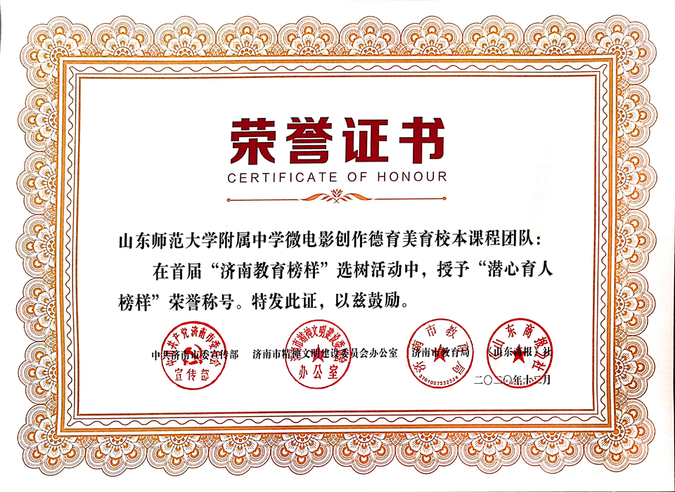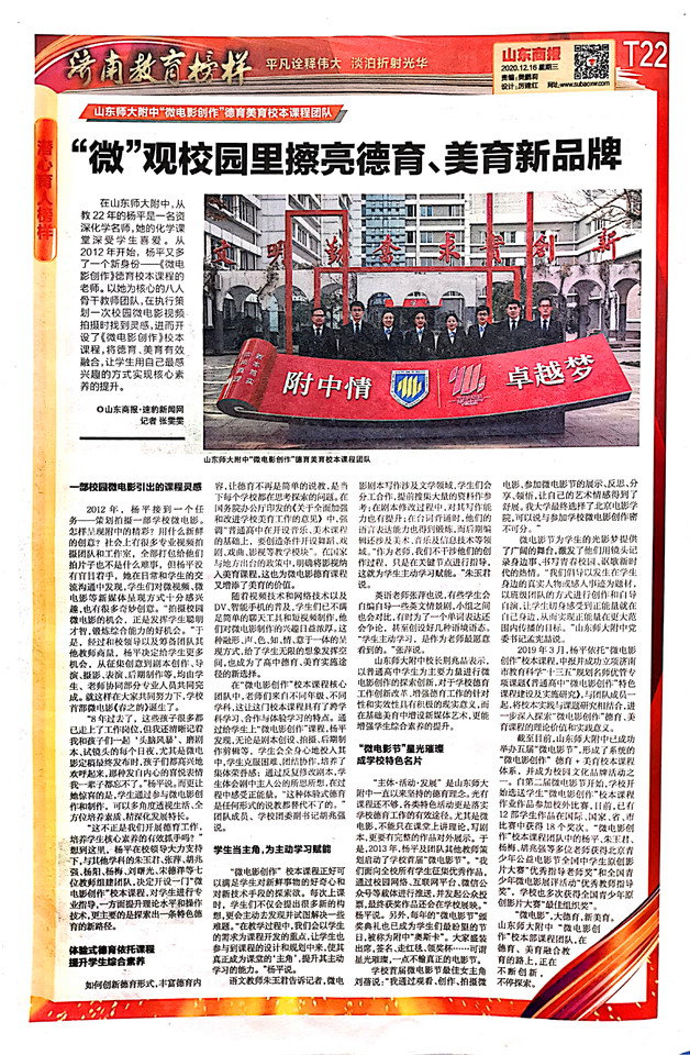 山东师大附中“‘微电影创作’德育美育校本课程团队”2012年开始建立,由杨平、朱玉君、张萍、胡兆强、杨阳、杨梅、刘曙光和宋德洋等八位教师组成。八年来,形成了系统的“微电影创作”德育+美育校本课程体系,同时创办了学校“微电影节”,鼓励学生创作微电影作品,倡导以发生在学生身边的真实人物或感人事迹为题材,以班级团队的方式进行创作和自导自演,让学生切身感受到正能量就在自己身边,从而实现正能量在更大范围内传播的目标。“微电影创作”德育+美育校本课程对于学校德育和美育工作改革创新、增强德育和美育工作的针对性和实效性具有积极的现实意义。截至目前,山东师大附中已成功举办五届“微电影节”,并有12部学生作品在国际、国家、省比赛中获得18个奖次,其中包括“第五届中欧青少年电影节最佳中学生影像奖”、全国青少年微电影大赛一等奖等等。山东师大附中多次获得全国青少年原创影片大赛“最佳组织奖”,“微电影创作”校本课程团队中的杨平、朱玉君、杨梅、胡兆强等多位老师获得北京青少年公益电影节全国中学生原创影片大赛“优秀指导老师奖”和全国青少年微电影展评活动“优秀教师指导奖”。