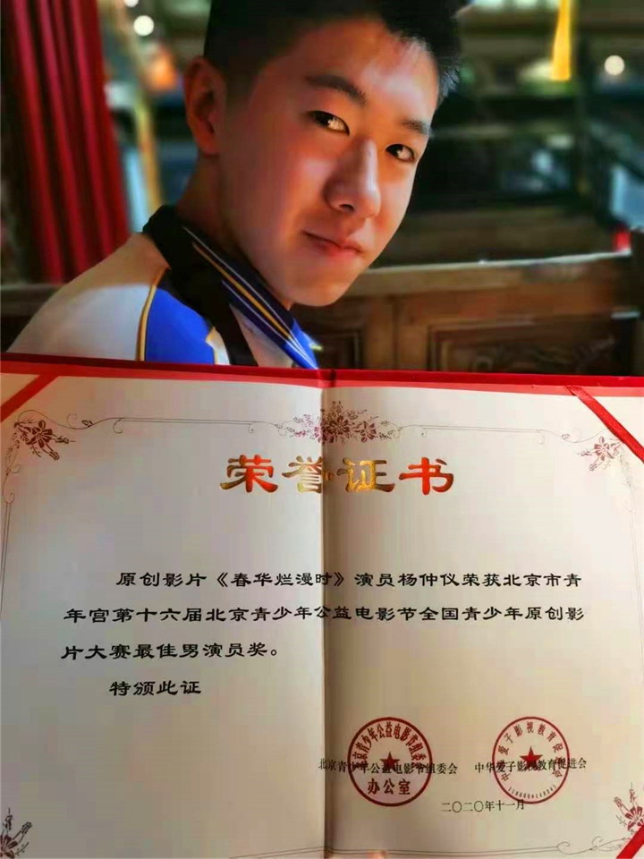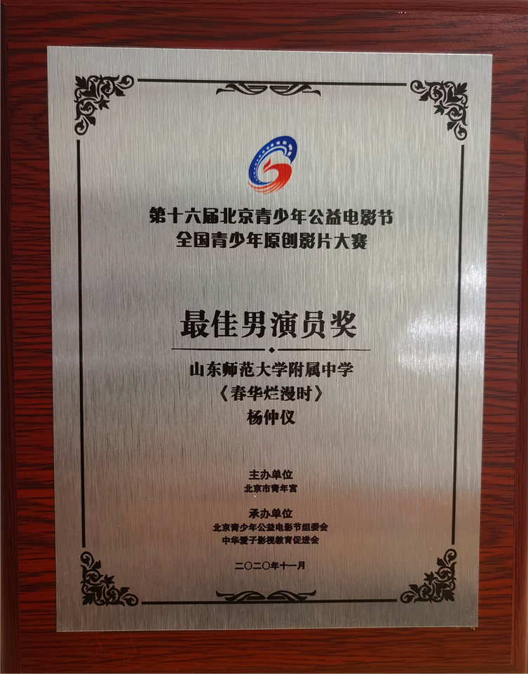 近日,从第十六届北京青少年公益电影节全国青少年原创影片大赛组委会传来好消息,评委会经过严格筛选,最终将本届电影节最佳男主角这一唯一殊荣颁发给山东师大附中推送的微电影《春花烂漫时》男主角、高二13班杨仲仪同学。