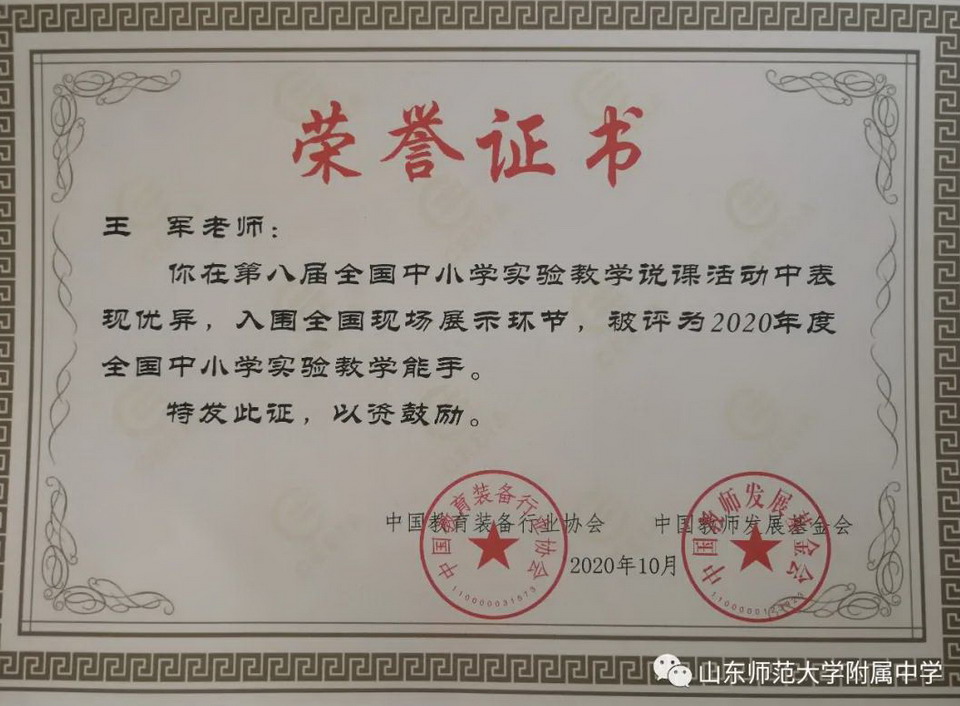 10月24日,第八届全国中小学实验教学说课活动现场展示环节在重庆举行。山东师大附中物理教师王军在现场展示环节中表现优异,被评为2020年度全国中小学实验教学能手。
