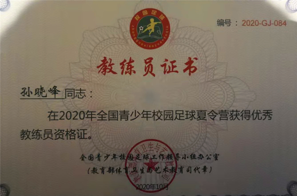 孙晓峰老师获优秀教练员奖