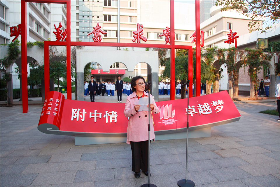 李新华老师是已经退休的语文组老教师,曾在附中任教37年之久,也是附中校友。她指出,历史,铸就了附中校魂:那就是承载历史,传承光荣,担当未来,追求卓越!附中人,锻造了附中精神:那就是共生存荣辱,做筋骨脊梁,行无私奉献,为时代贡献!她真诚地期盼,无论是佩戴附中红色校徽的老师,还是身穿附中蓝白校服的学生,都能生逢其时,责任在肩,为祖国的发展贡献力量!