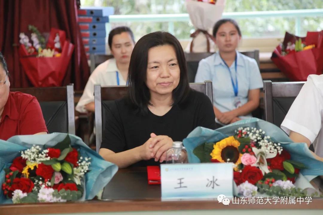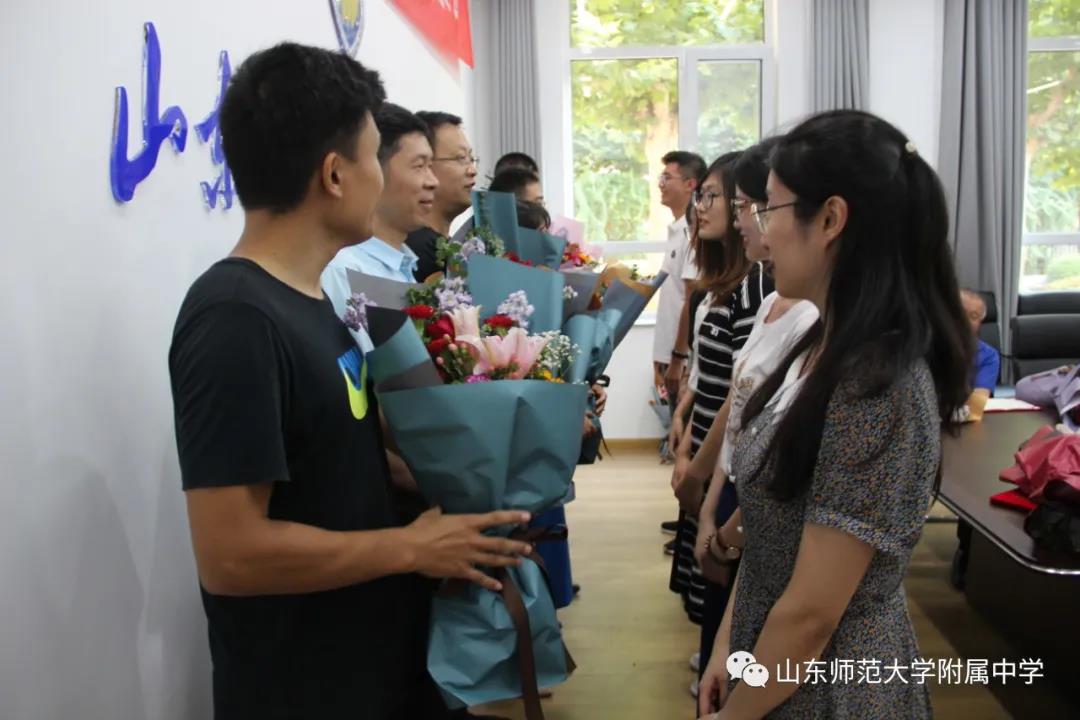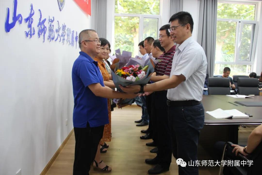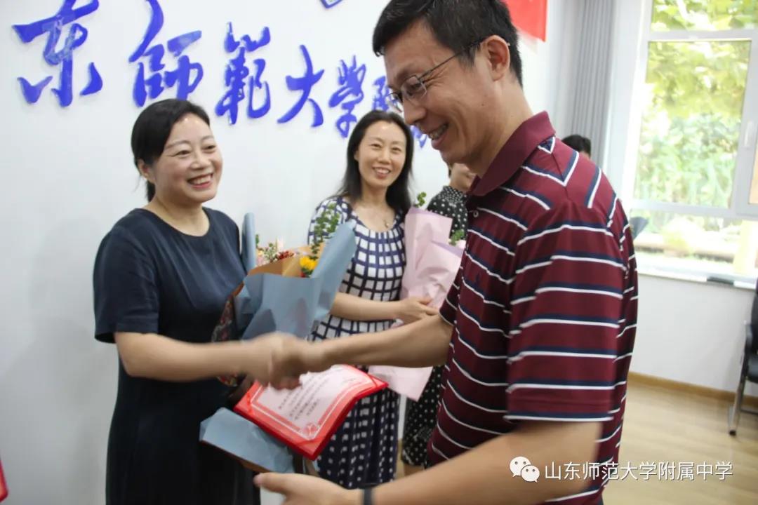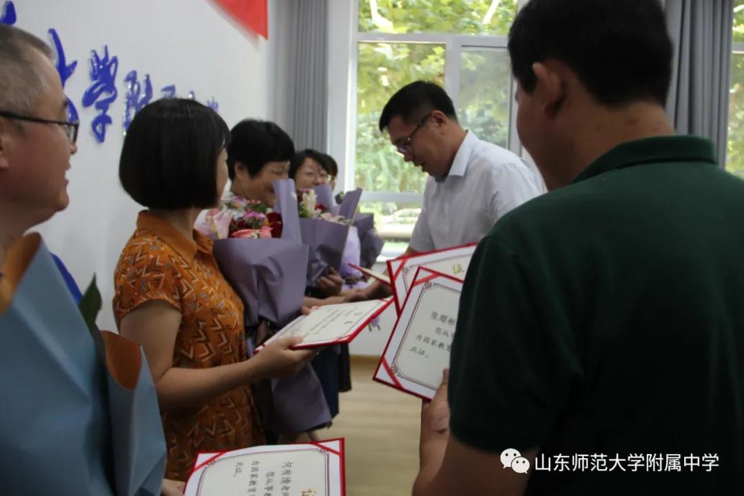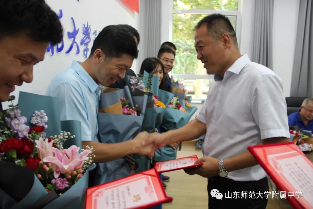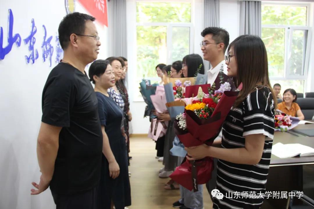 座谈会上,荆兆晶、孟宪喆为王冰、李明、史宏伟、何有清、卢玉芳、王慧、杨洪漪、张耀彬等八位光荣从教三十周年教师颁发荣誉证书。学校领导为曲国勇等25位指导教师颁发聘任证书。附中2020年新入职教师为自己的教学工作指导教师和班主任工作指导教师献花,行礼拜师。