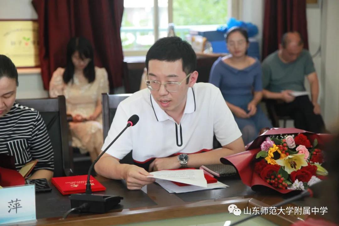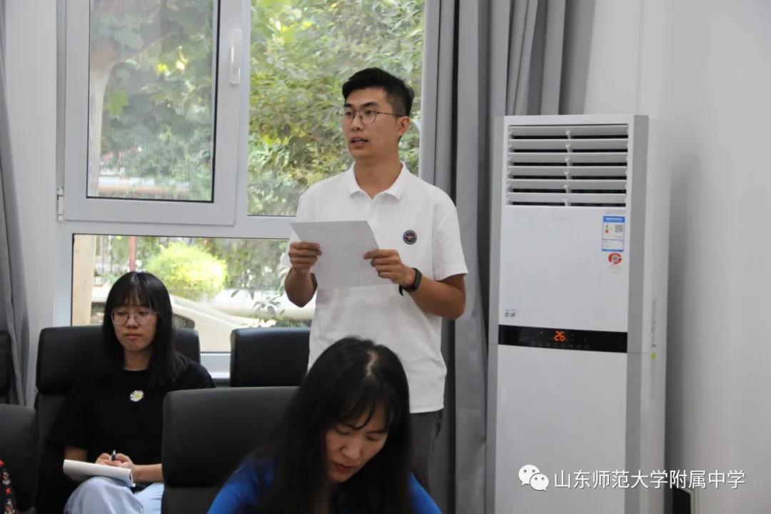 新入职教师代表刘武洋、郇志远分享了他们初来即感受到的附中先进的教育理念、严格细致的学生管理和附中教师的专业水平、敬业精神、人格魅力。他们代表新入职教师郑重承诺:坚持读书学习,提高自身专业素养和人文修养,坚持虚心学习、请教,为学生的终身发展尽自己最大的努力。