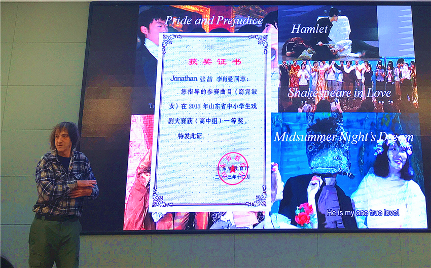 活动中,济南外国语学校外教 Jonathan首先作报告,介绍了辅导学生戏剧表演的做法与经验,并播放了指导的学生戏剧《仲夏夜之梦》;随后,学校莎翁戏剧社的学生们为在场教师现场表演了莎士比亚的经典喜剧《无事生非》;最后,济南市教研室英语教研员徐汉东做总结发言,他指出,这类英文名著戏剧表演活动适应了普通高中课程改革的要求,有利于推进济南市高中英文名著阅读教学,通过这种高中英文名著阅读与表演结合的形式能够帮助提升学生的英文阅读素养,提高他们的表达能力和创新能力,进而增强他们的综合素质。