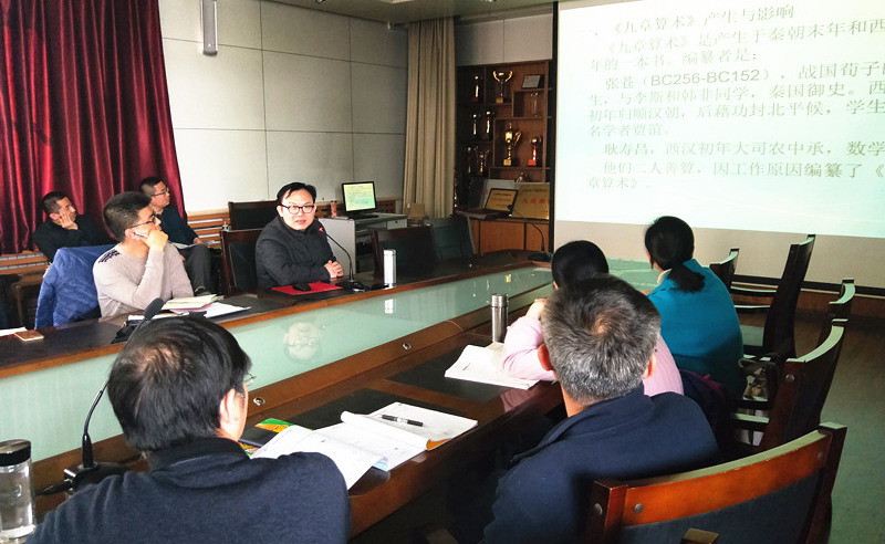 为迎接国际数学节的到来,3月13日下午,山东师大附中邀请到山东师范大学数学与统计学院教授杨泽忠为全体数学教师作《九章算术》专题报告,报告由数学教研组副组长孙腾飞主持。