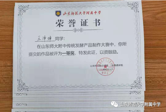 本次传统发酵产品制作比赛,经过生物组老师的认真评选,评出一、二等奖,并颁发了荣誉证书。