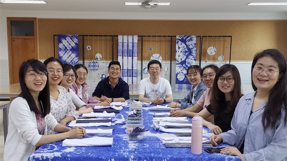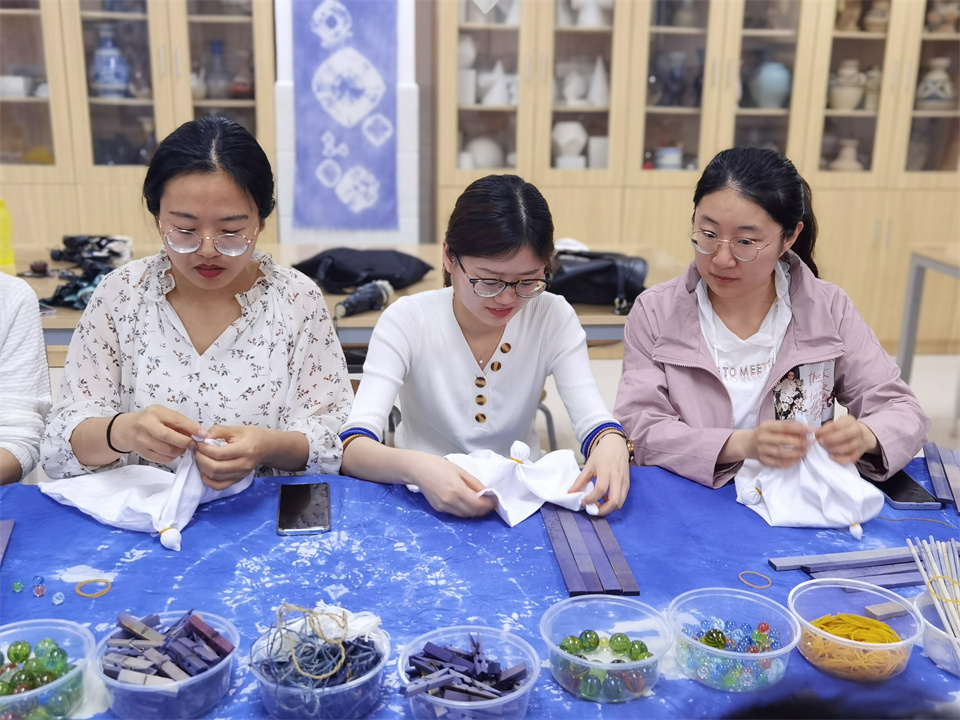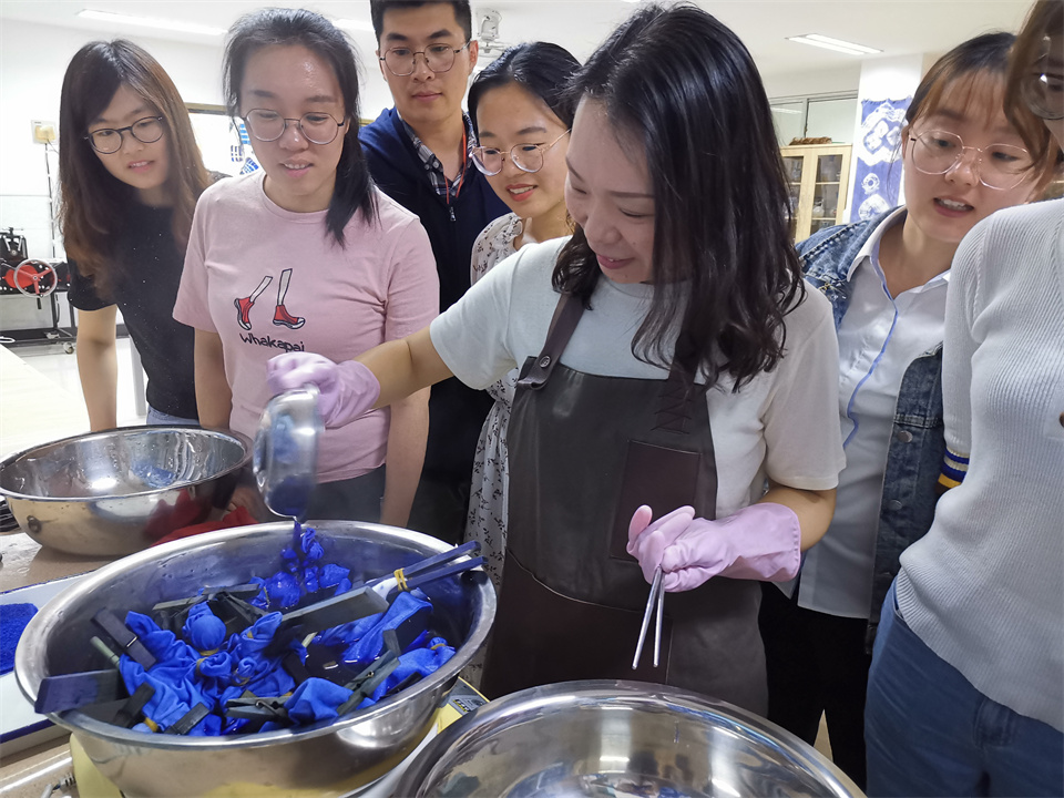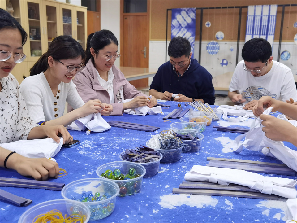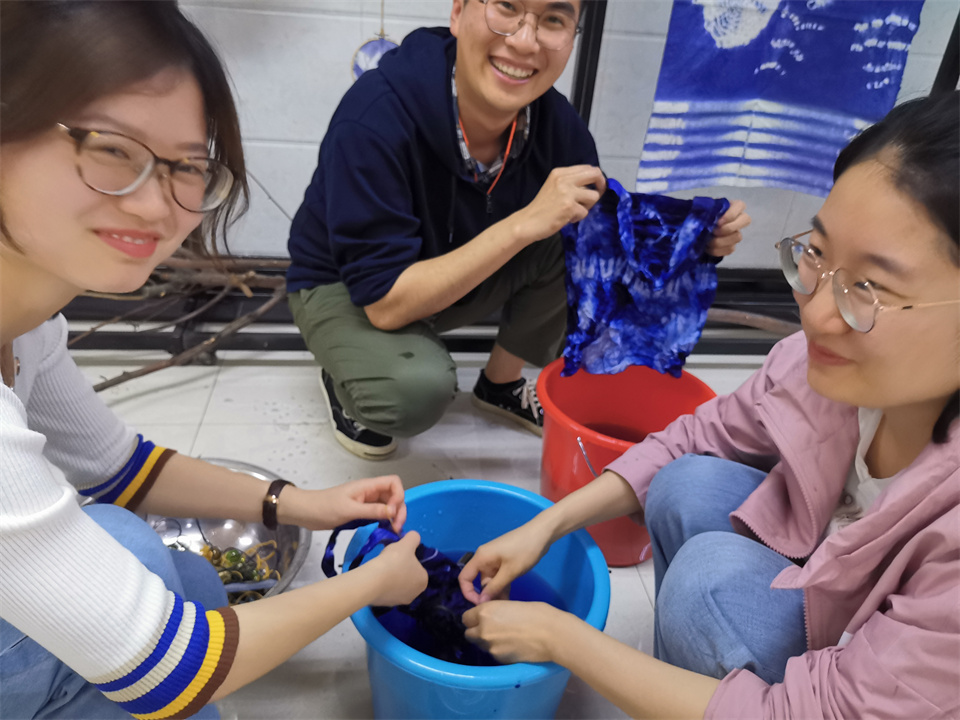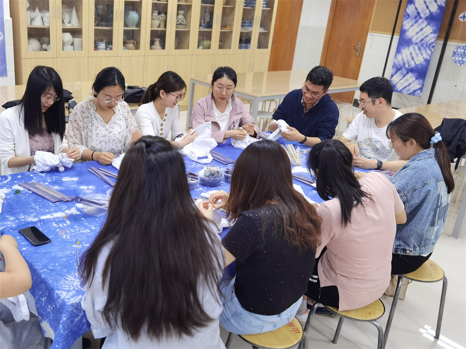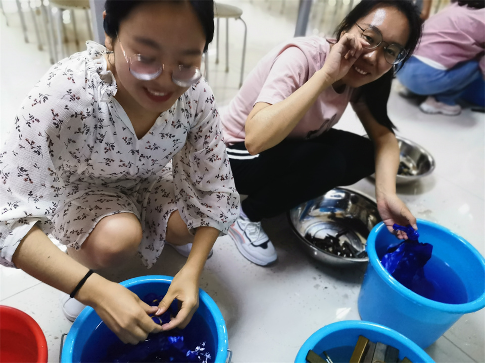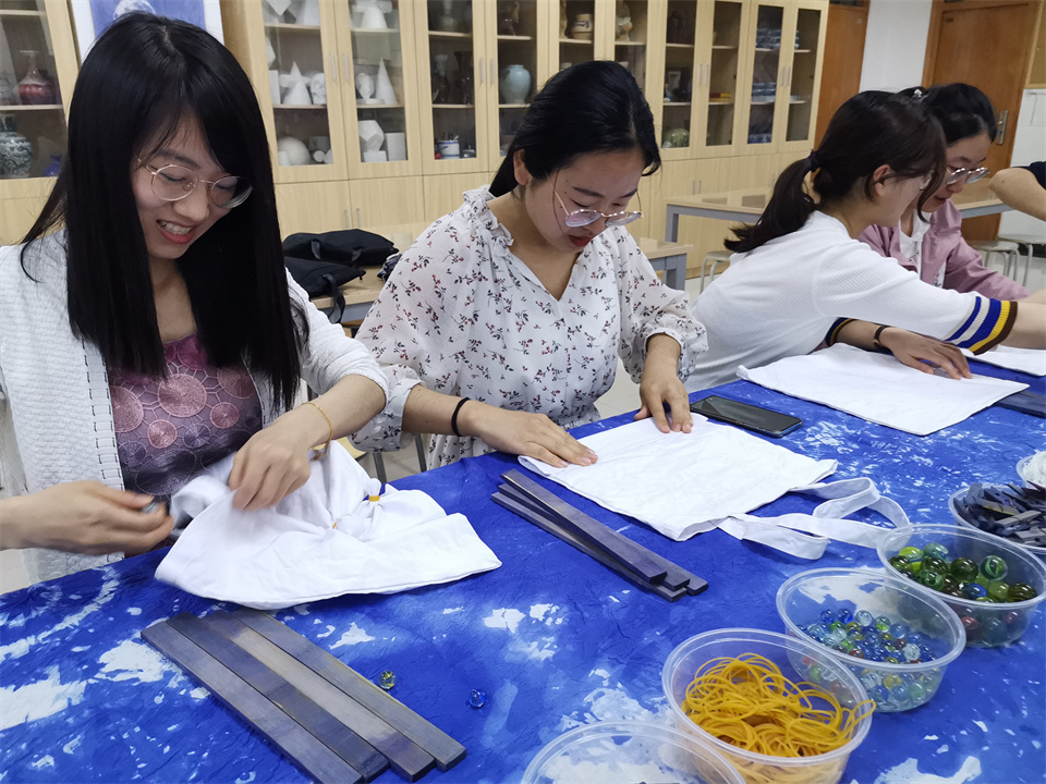 第二环节,王欣从国际时装周、明星电影红毯服装以及日常生活中常见的扎染元素开篇,使学员们快速且充分地感受到扎染艺术的魅力。其次,通过观看视频以及现场演示等环节,详细介绍了扎染需要的材料、程序步骤和方法。最后,动手体验扎染。在此环节,王欣老师带领全体学员将学习到的扎染知识在动手制作中去深刻感受与体会,每位学员完整感受了“扎”和“染”的过程,并在王欣老师指导下顺利地完成了自己的扎染作品。