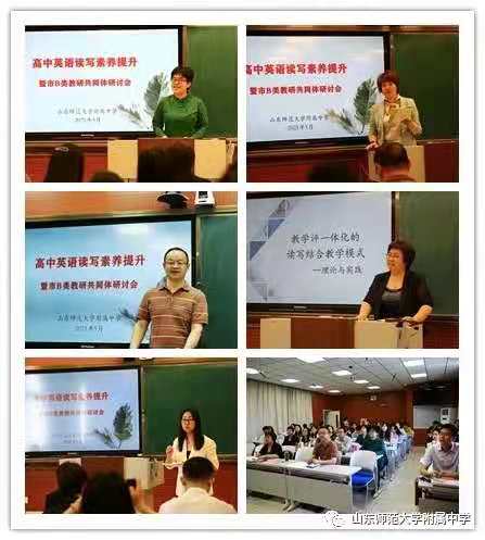5月25日,济南市高中英语读写素养提升暨高中英语B类教研共同体专题研讨会在山东师大附中幸福柳分校举行,并进行全市直播。济南市教育教学研究院高中英语教研员徐汉东,山东师范大学外国语学院教授徐立乐,山东师大附中副校长陈德海,分校区执行校长助理王彬、教务处主任李成金,共同体部分成员校山东师大附中、济南一中、济南中学英语教研组部分教师出席现场活动。本次活动聚焦“读写素养”,以“读后续写”为载体,开展“同题异构”教学与研讨,旨在加强区域教研合作,促进教师专业发展和“学科核心素养”有效落地,提升学生英语读写素养。活动由山东师大附中英语教研组长李敏主持。