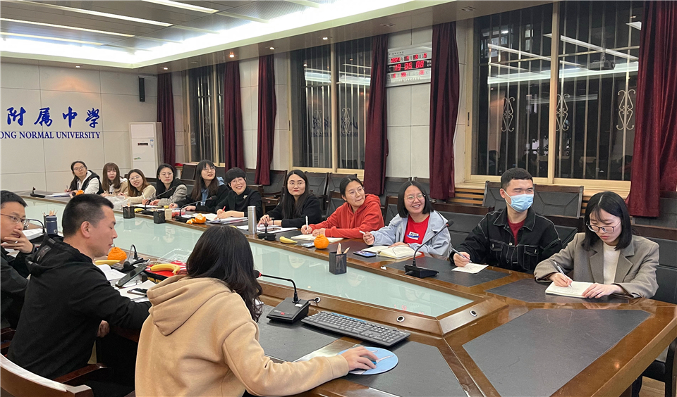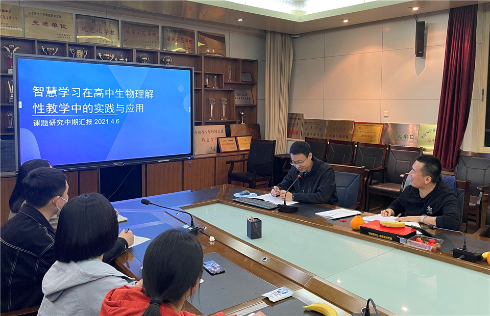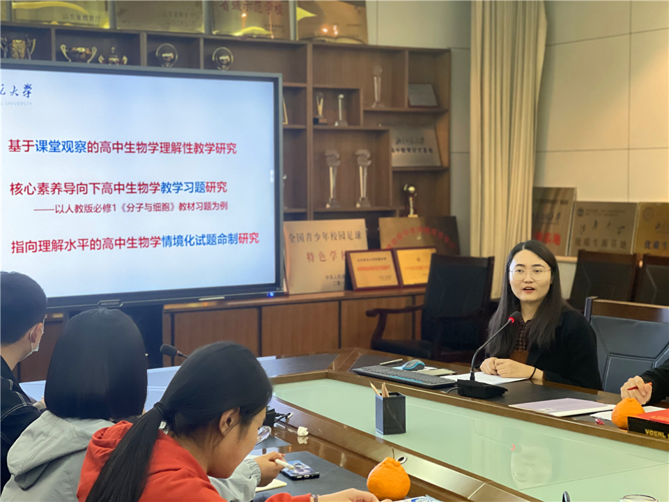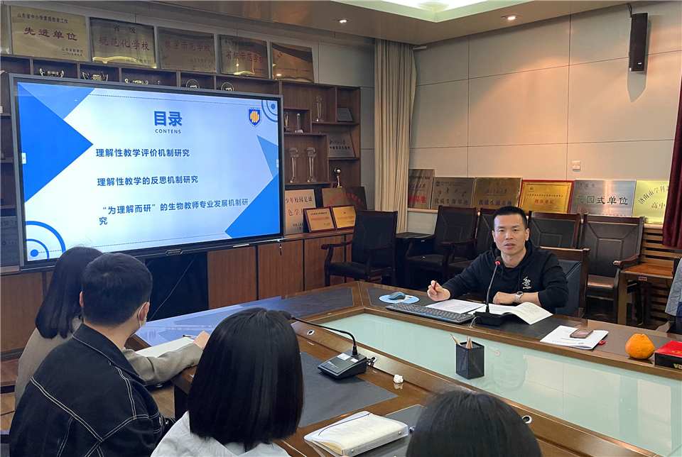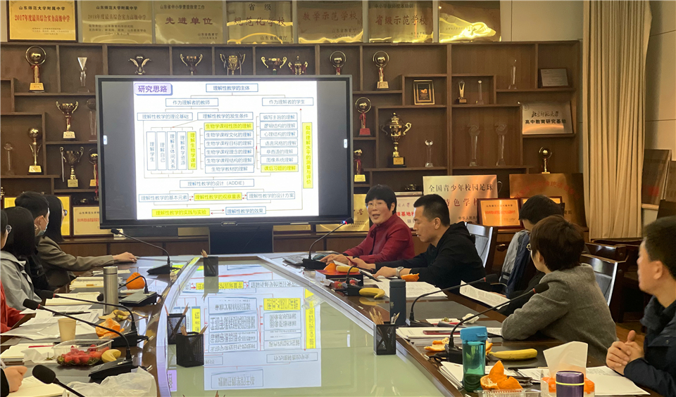 为总结课题阶段性研究成果,分析研究过程中存在的问题,为后续深化研究研商对策,2021年4月6日晚7:00,山东师大附中山东省教育科学规划课题“高中生物理解性教学体系建构与实践研究”(项目编号:YC2019129)课题组在校本部办公楼二层西会议室召开阶段研究成果交流会。课题组指导专家、山东师范大学生命科学学院徐宜兰副教授莅临指导并作专题报告,山师大生科院研究生徐宁代表子课题组作研究成果展示,课题组全体成员参加会议,山师大生科院学科教学论11位研究生参加研讨会,会议由课题主持人、校本部教科处主任李贵玲主持。