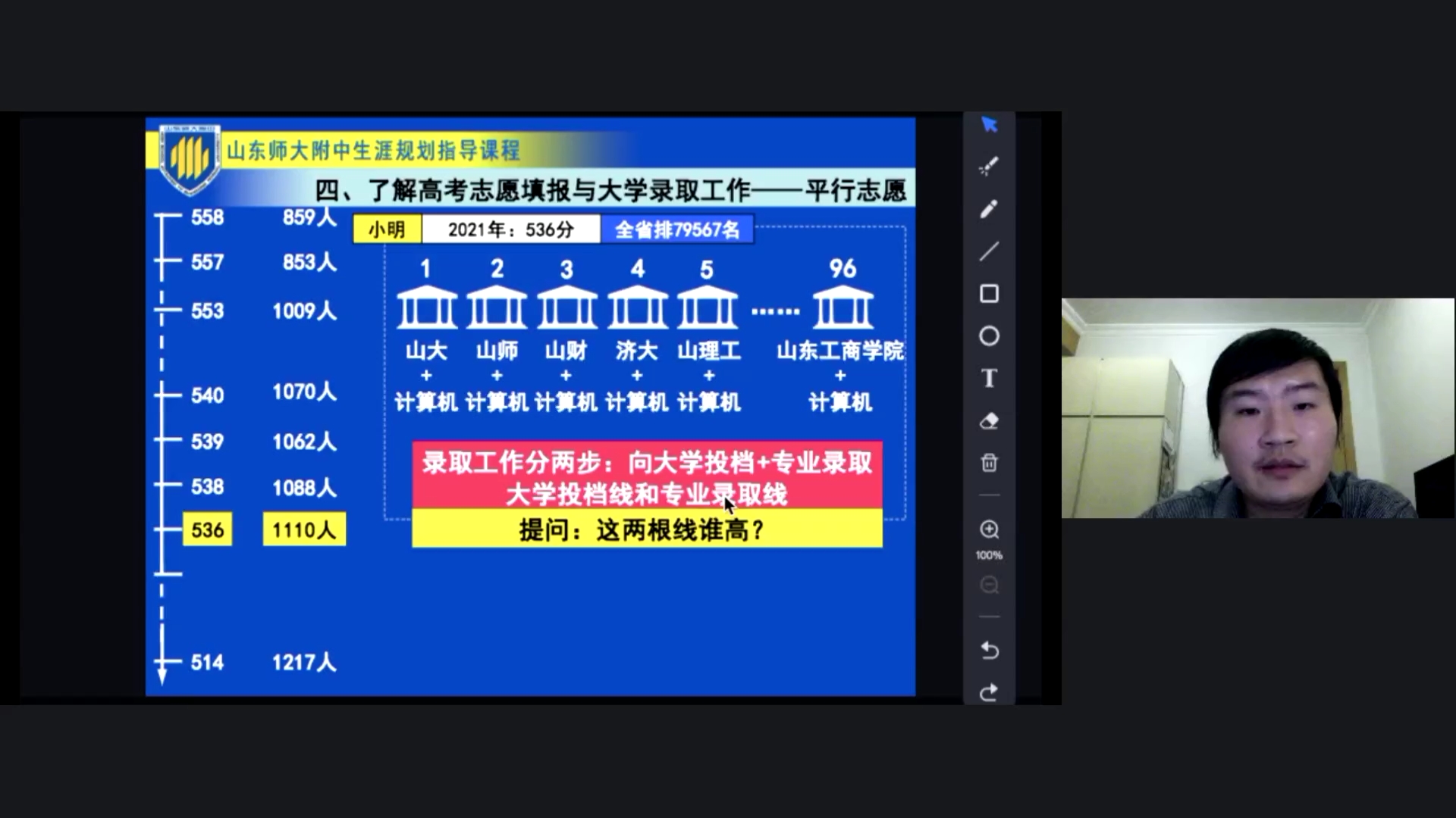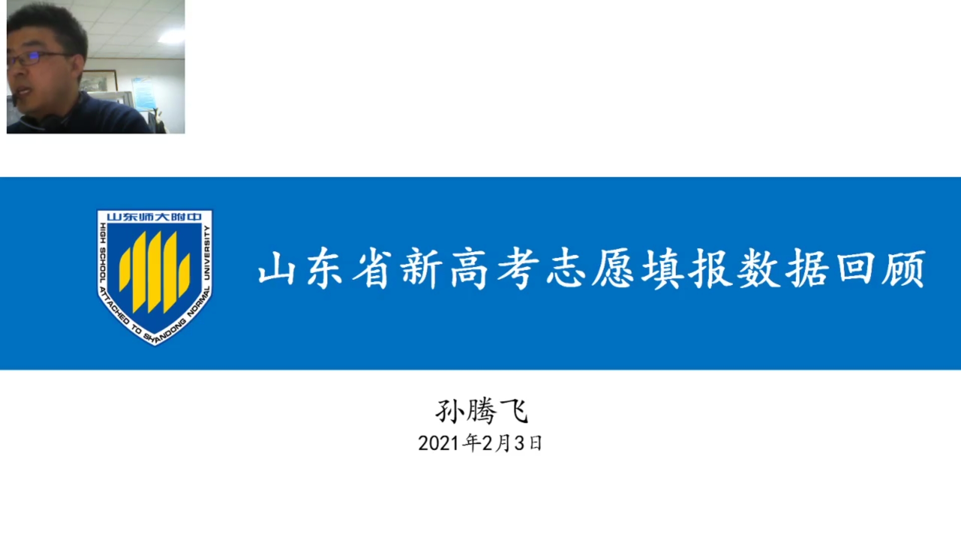 在《山东省新高考志愿填报数据回顾》讲座中,孙腾飞老师在整体介绍新高考核心要点的基础上,系统分析了我省2020年高考数据,有针对性地进行新高考志愿填报指导。在回顾我省2020年高考数据上,孙腾飞老师既介绍了2020年全省整体录取、志愿提报、选科组合录取等方面的情况,又重点结合滑档、退档、志愿征集等特殊情况进行了深入浅出的分析。在新高考志愿填报指导上,孙腾飞老师从专业、院校、机会、风险等5个方面,为学生及家长提供了全方位立体化的志愿填报建议。